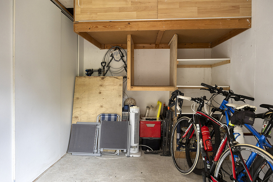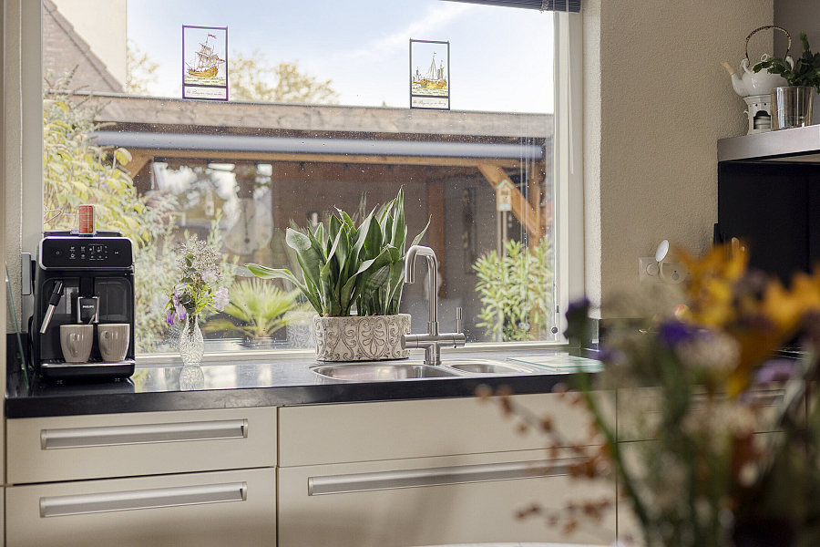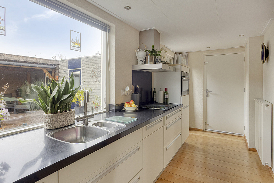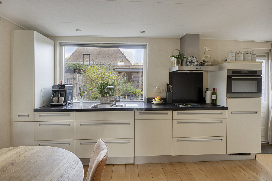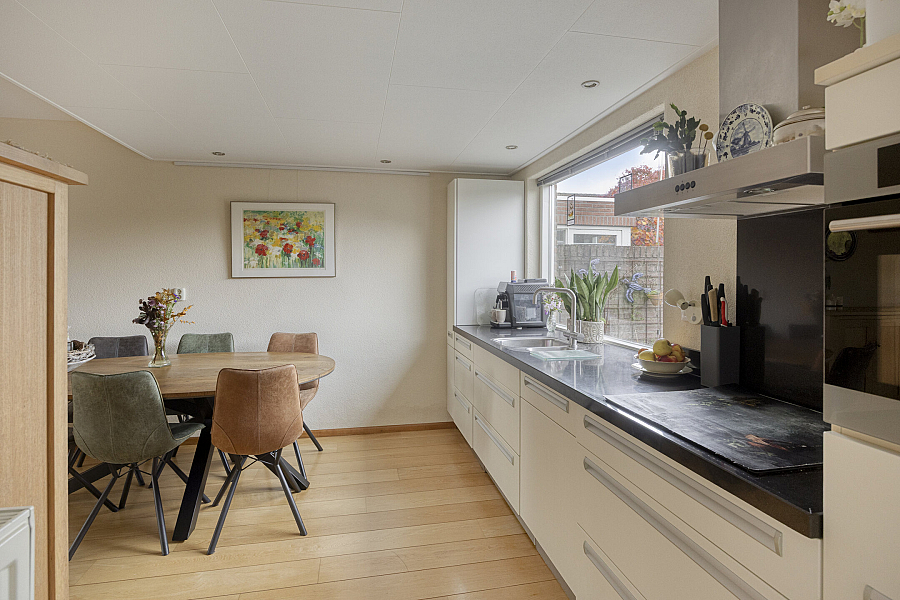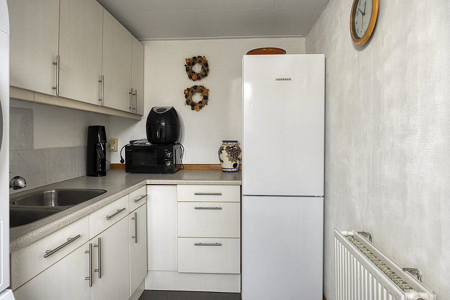 De voormalige garage met elektrische sectionaaldeur is omgebouwd tot royale berging, tussenhal en bijkeuken met extra keukenblok en opstelplaats voor wasmachine en droger – ideaal voor extra opslag, wasruimte en/of hobbyruimte.