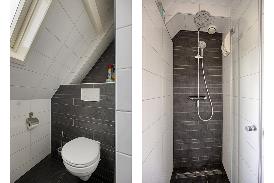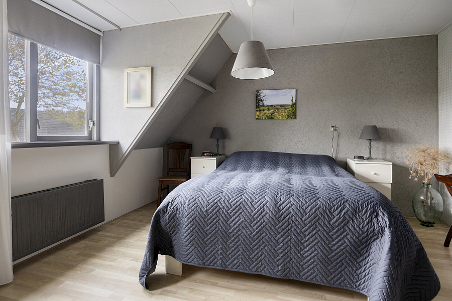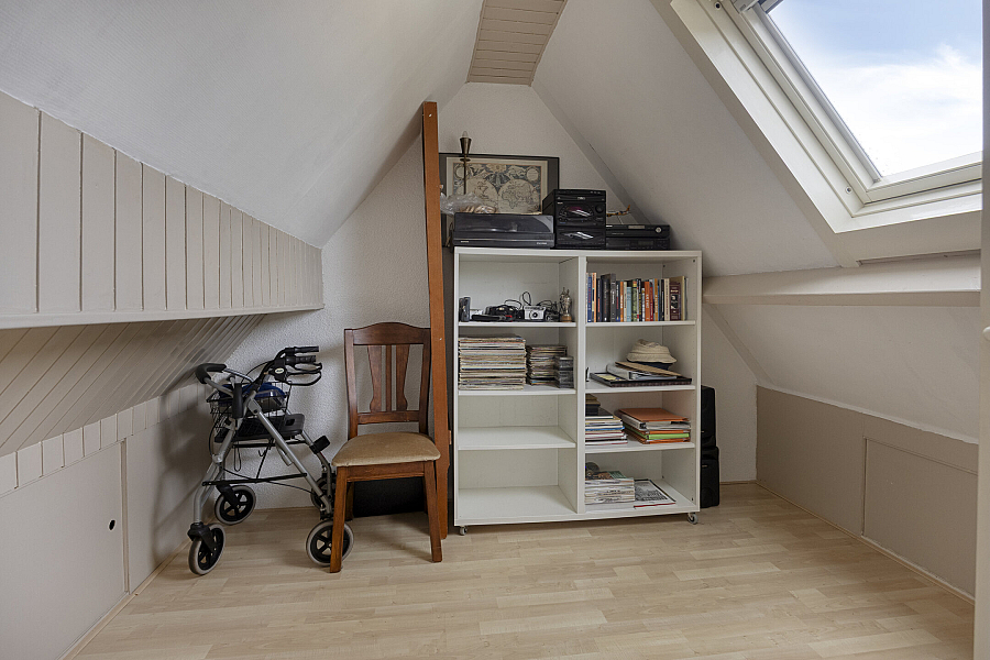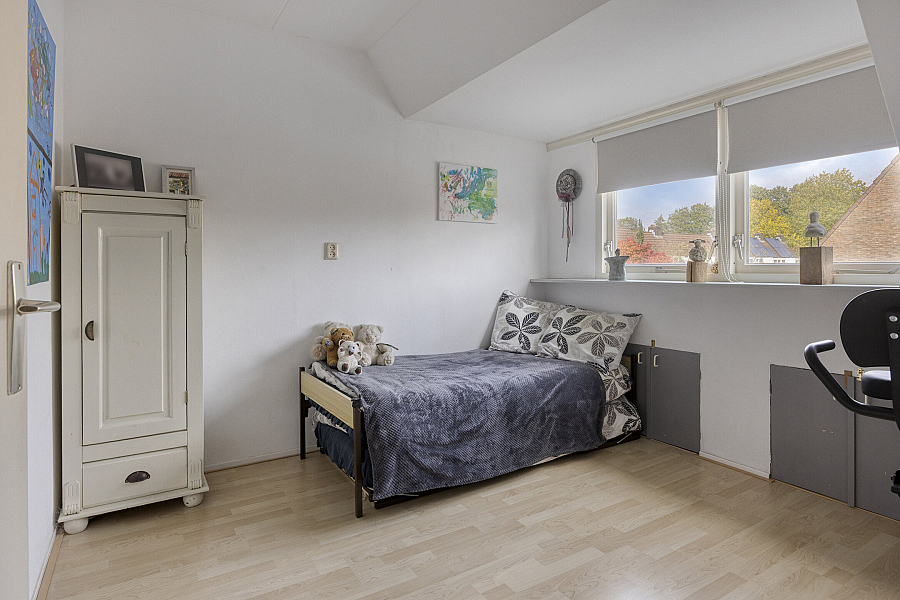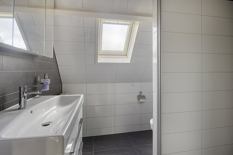 Dankzij de dakkapellen aan de voor- en achterzijde is de verdieping heerlijk licht en ruim. Momenteel zijn er twee slaapkamers, waarvan één extra grote slaapkamer met garderoberuimte (eenvoudig weer te splitsen in 2 slaapkamers). De badkamer is netjes afgewerkt en voorzien van een douchecabine, wastafelmeubel en hangend toilet.