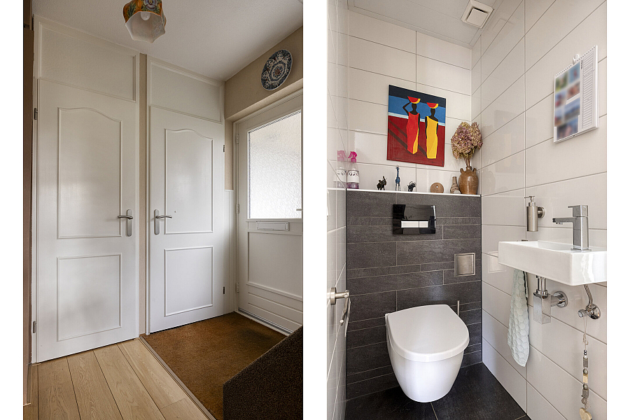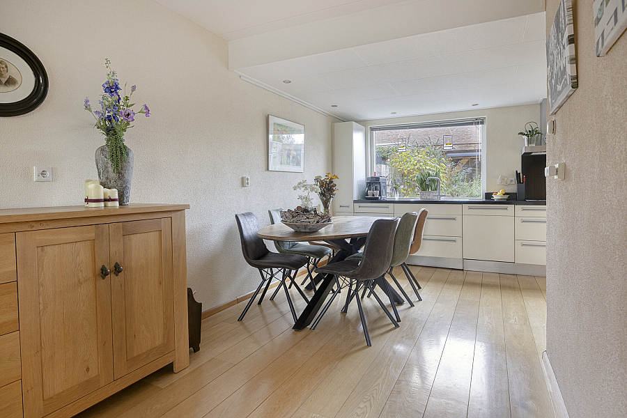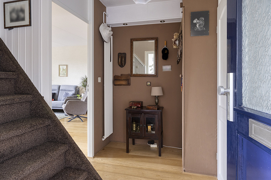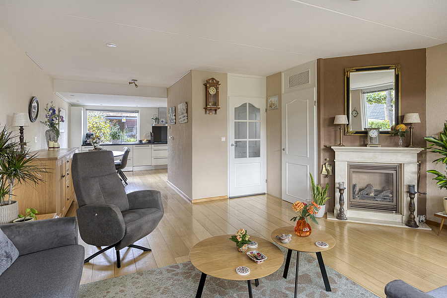Via de overdekte entree kom je in de hal met toiletruimte voorzien van een hangend toilet en fontein. De sfeervolle woonkamer is voorzien van een gashaard en praktische trapkast. Aan de achterzijde bevindt zich de uitgebouwde open keuken, uitgerust met moderne inbouwapparatuur: inductiekookplaat, oven, afzuigkap, koelkast en vaatwasser.