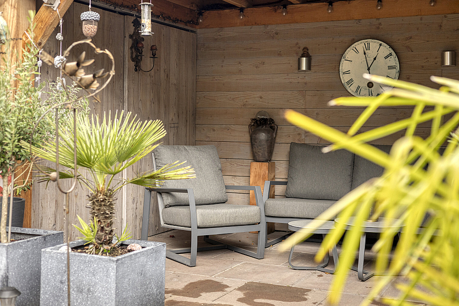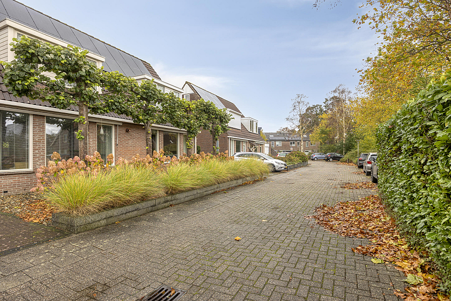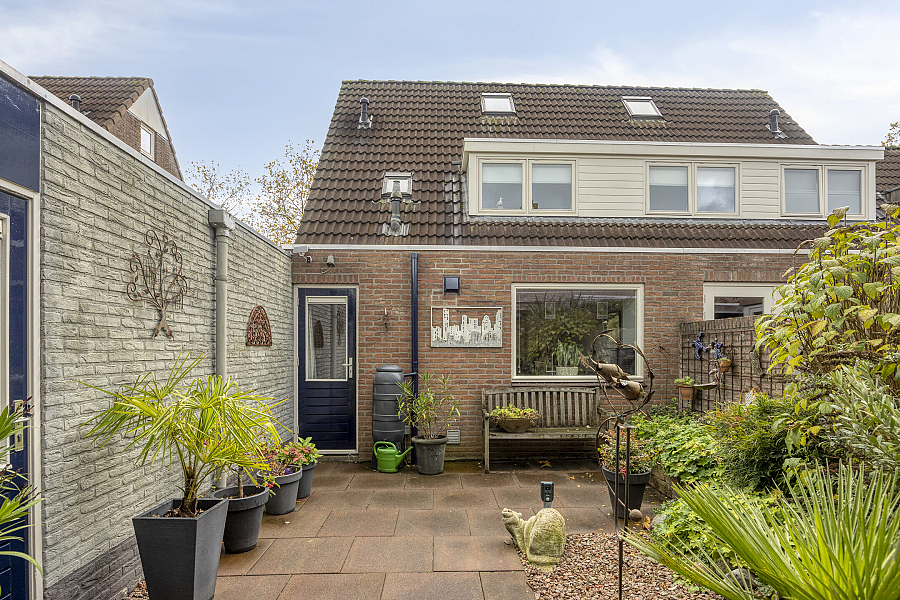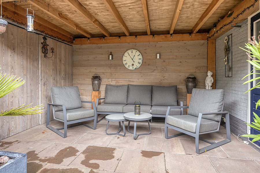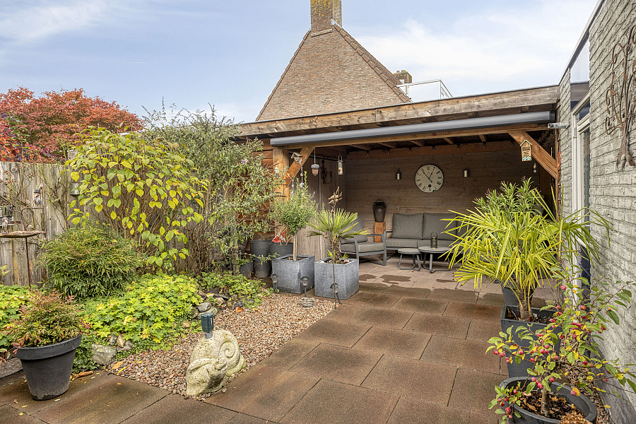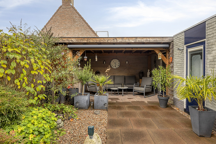 De achtertuin is verzorgd aangelegd en beschikt over een sfeervolle overkapping met kastruimte en een royale berging – een heerlijke plek om te ontspannen in elk seizoen.