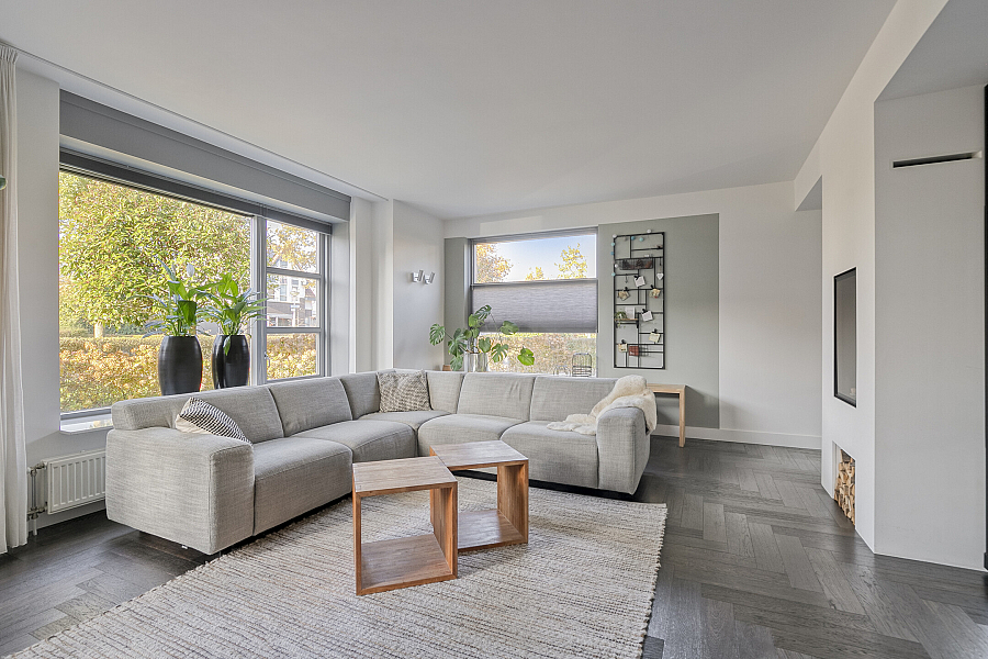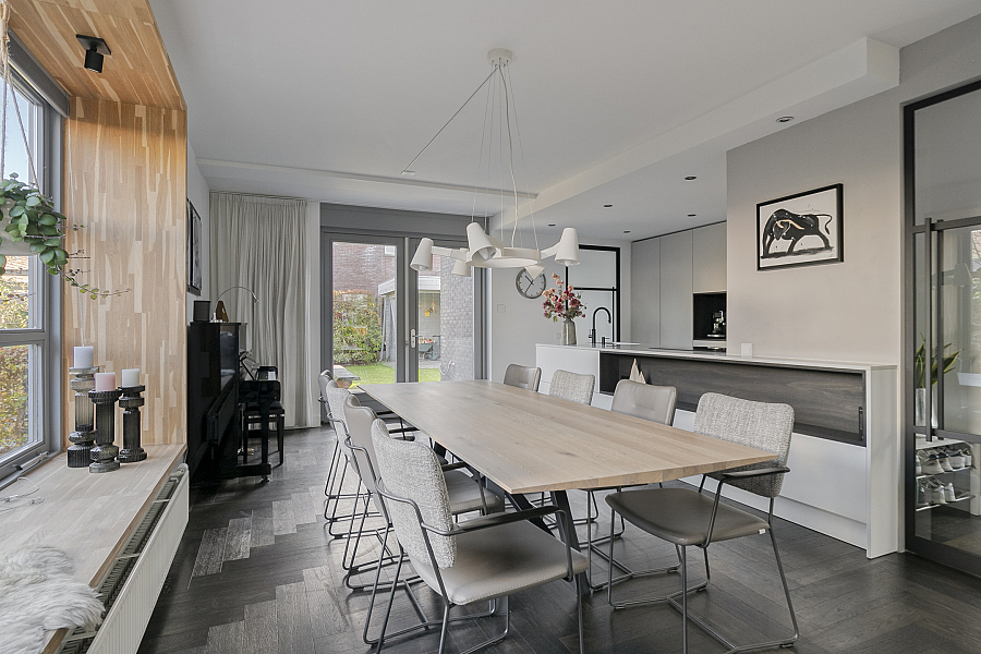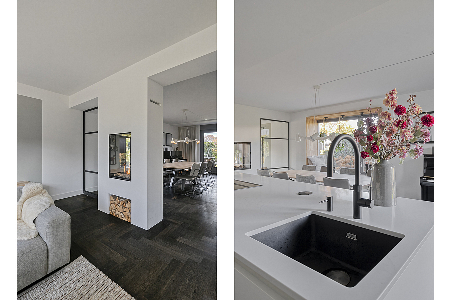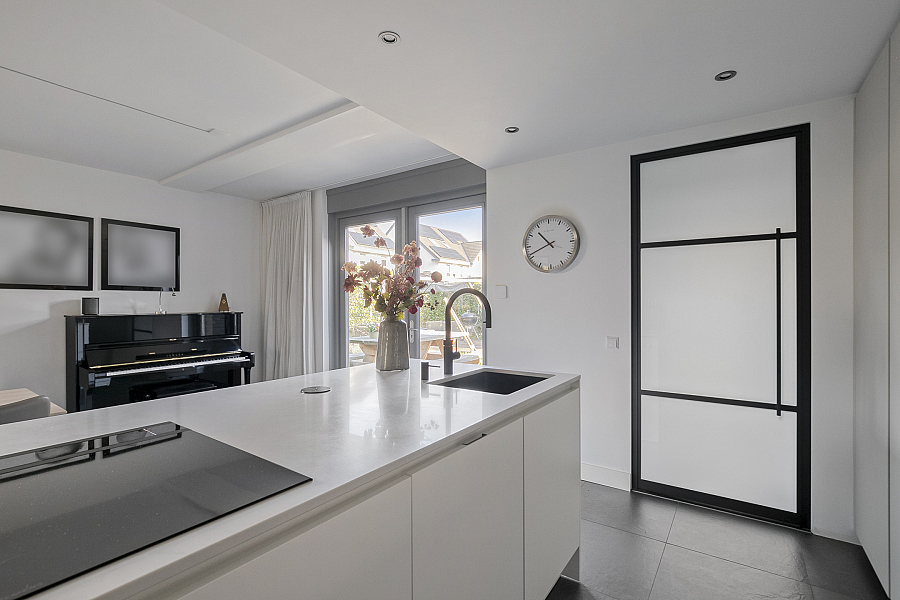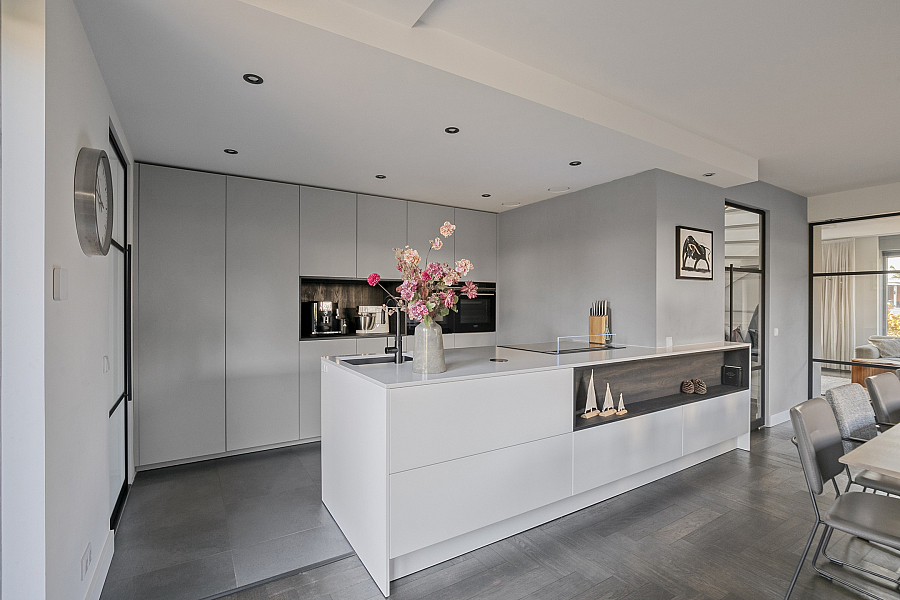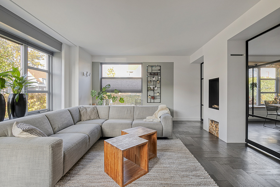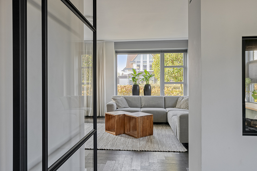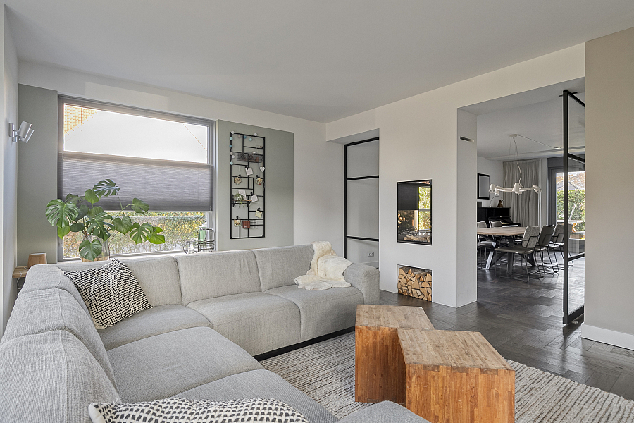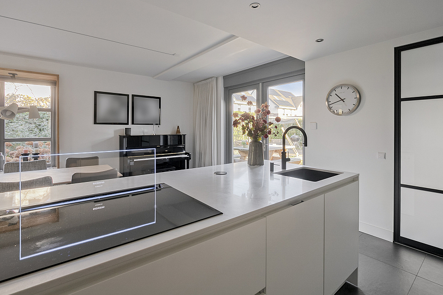 De begane grond heeft een stijlvolle houten visgraatvloer, strak gestuukte wanden en plafonds en een roomdivider met doorkijk-gashaard en taatsdeuren tussen de woonkamer en keuken. De nieuwe keuken is een echte eyecatcher en voorzien van alle luxe: een Quooker Cube, Siemens inductiekookplaat met downdraft afzuiging, vaatwasser, grote koelkast en vriezer, stoomoven en combi-oven, afgewerkt met een marmerlook werkblad. Vanuit de keuken is er toegang tot de bijkeuken en de ruime, geïsoleerde garage.