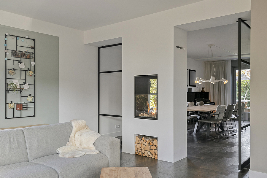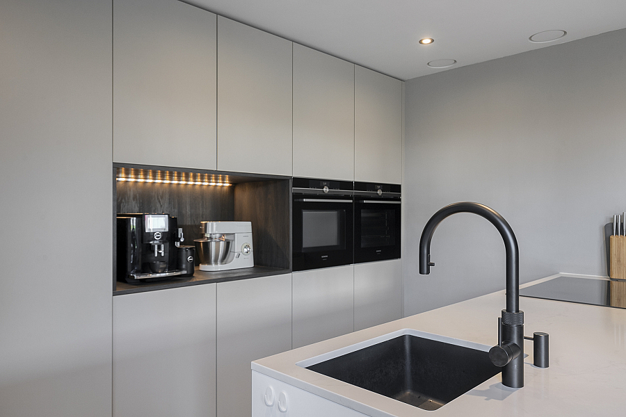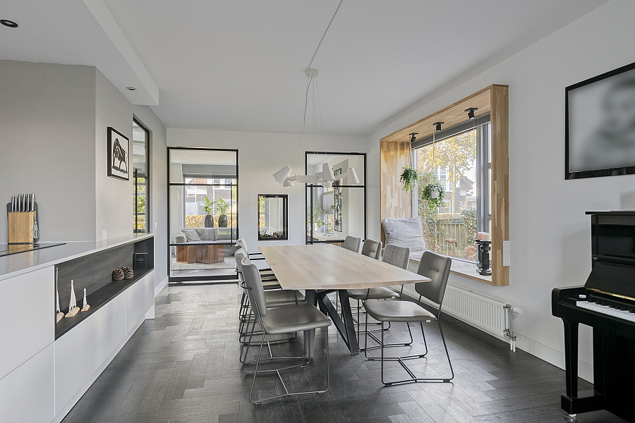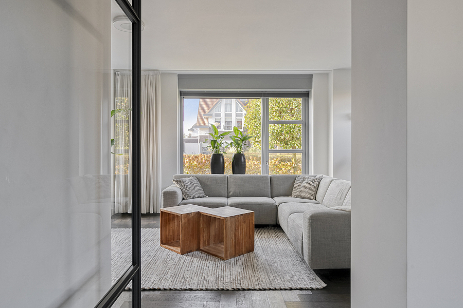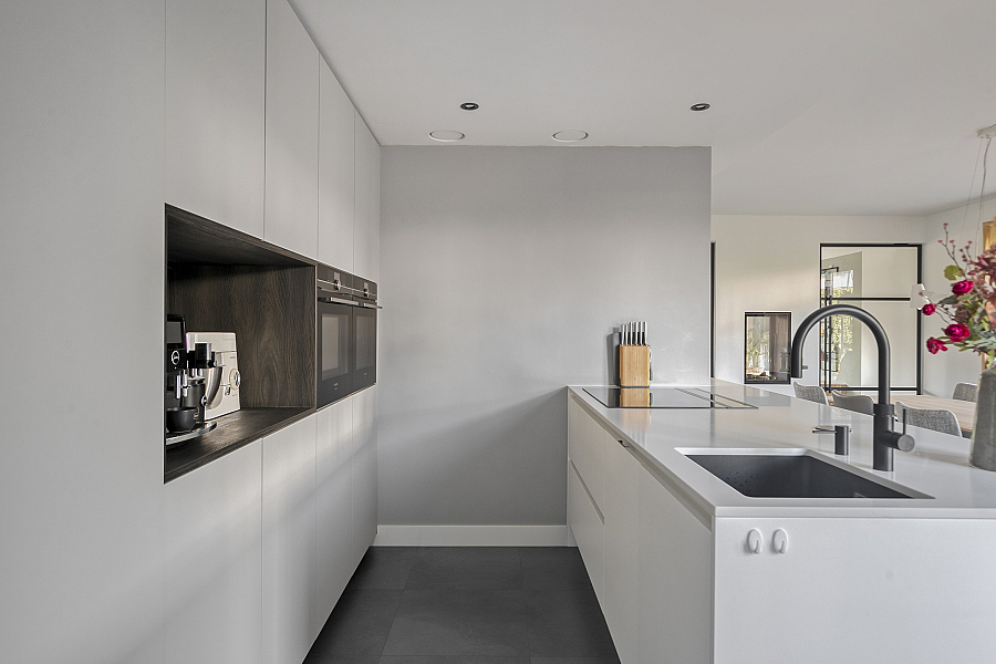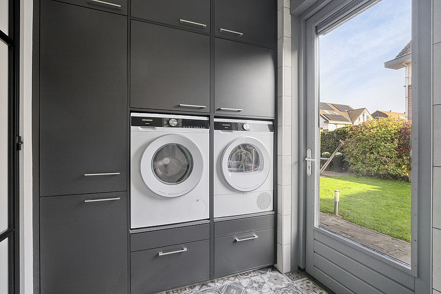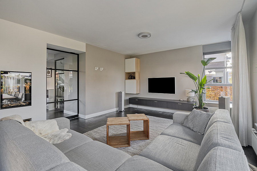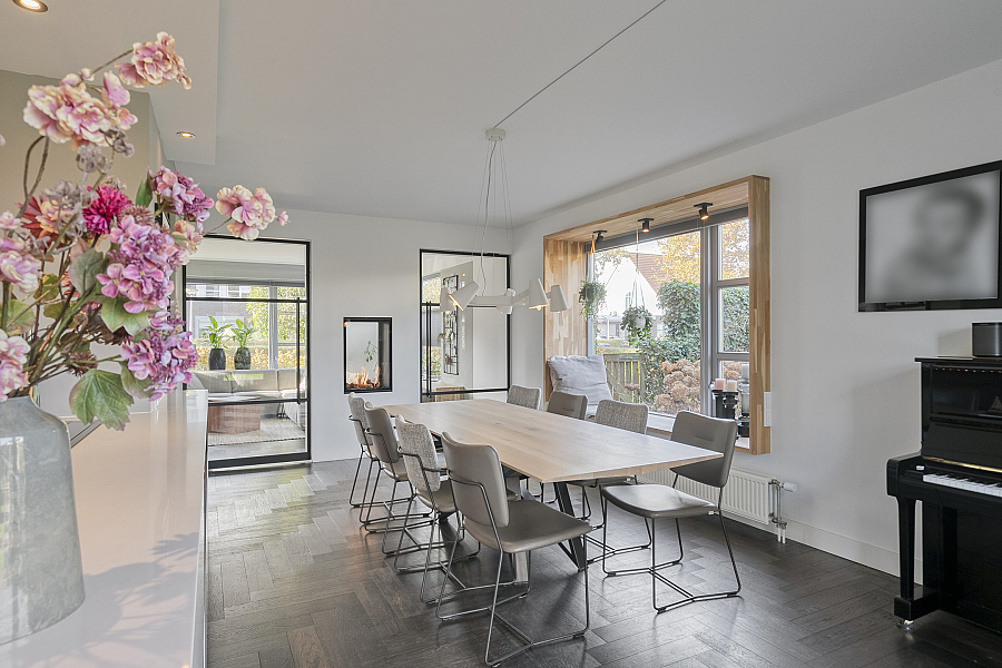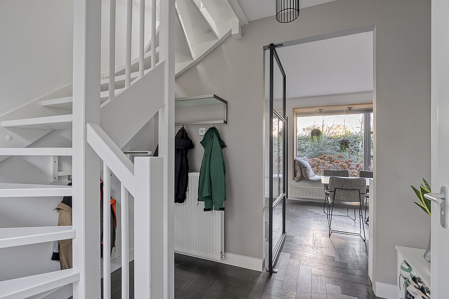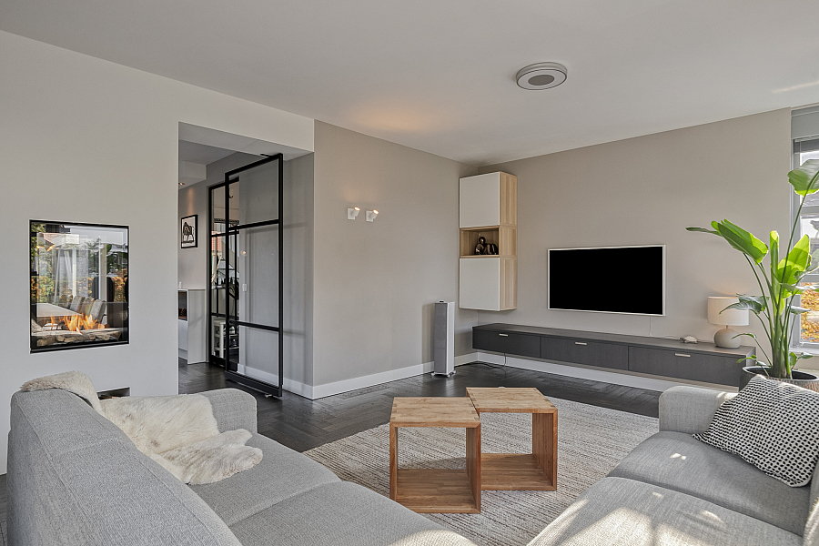 De begane grond heeft een stijlvolle houten visgraatvloer, strak gestuukte wanden en plafonds en een roomdivider met doorkijk-gashaard en taatsdeuren tussen de woonkamer en keuken. De nieuwe keuken is een echte eyecatcher en voorzien van alle luxe: een Quooker Cube, Siemens inductiekookplaat met downdraft afzuiging, vaatwasser, grote koelkast en vriezer, stoomoven en combi-oven, afgewerkt met een marmerlook werkblad. Vanuit de keuken is er toegang tot de bijkeuken en de ruime, geïsoleerde garage.