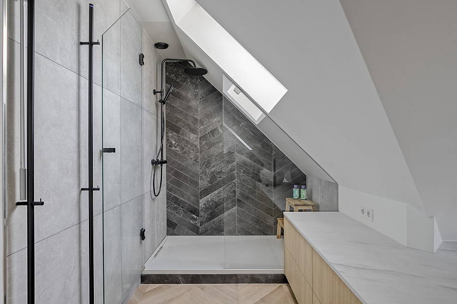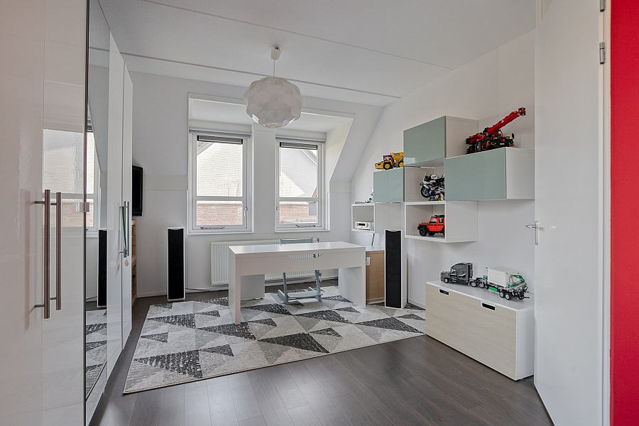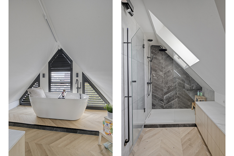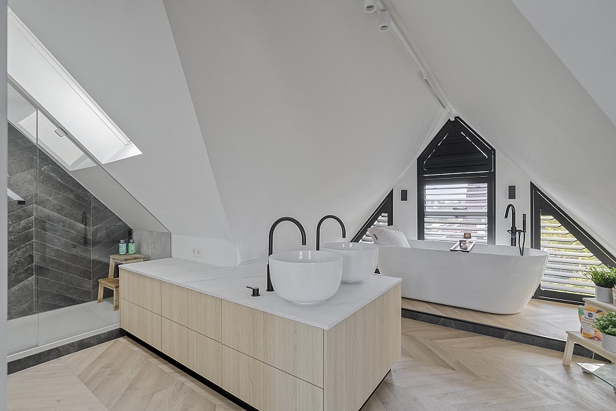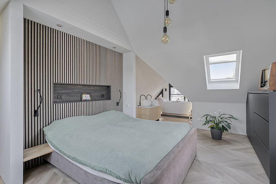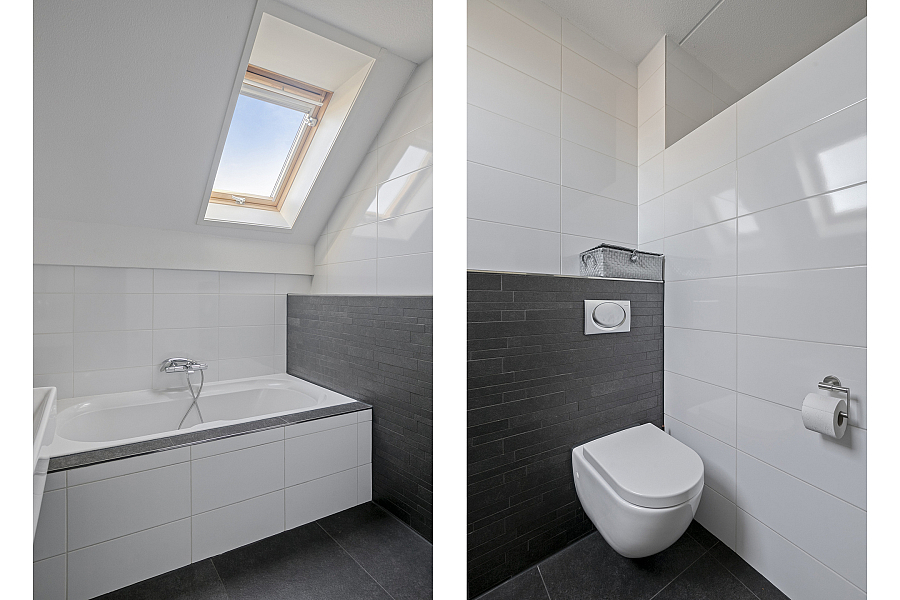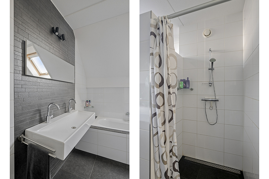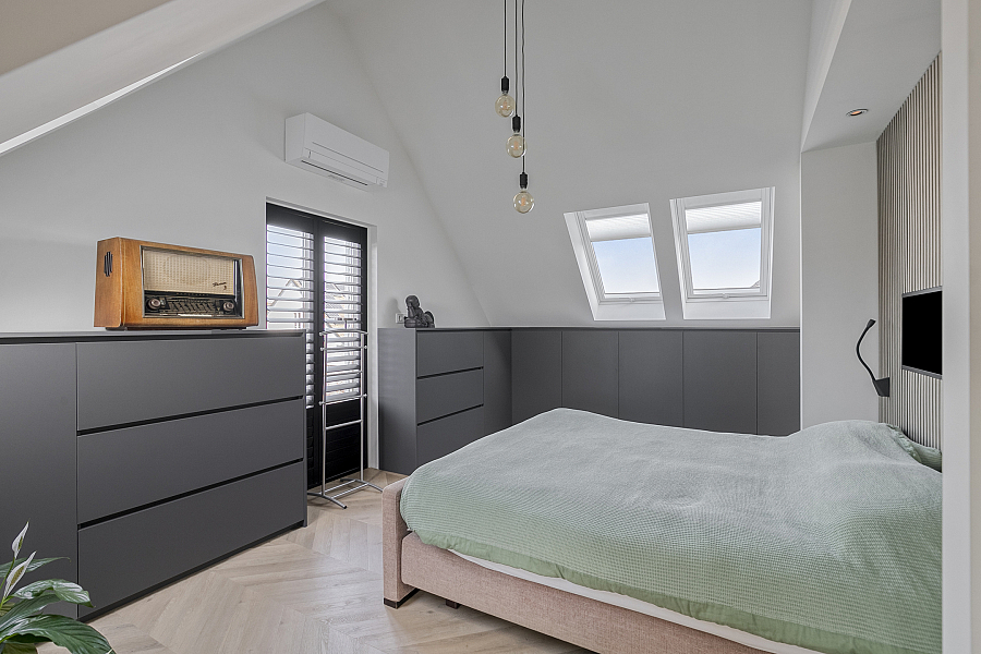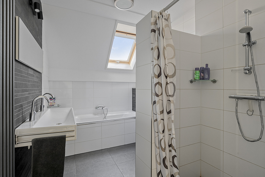 De tweede verdieping is een echte verrassing: een royale master suite met vrijstaand bad, inloopdouche, vier Velux-dakramen en houten jaloezieën.. Hier geniet je elke dag van het gevoel van een luxe hotel! Daarnaast is er een technische ruimte met zonneboiler en ATAG cv-ketel (april 2024).