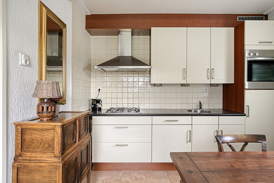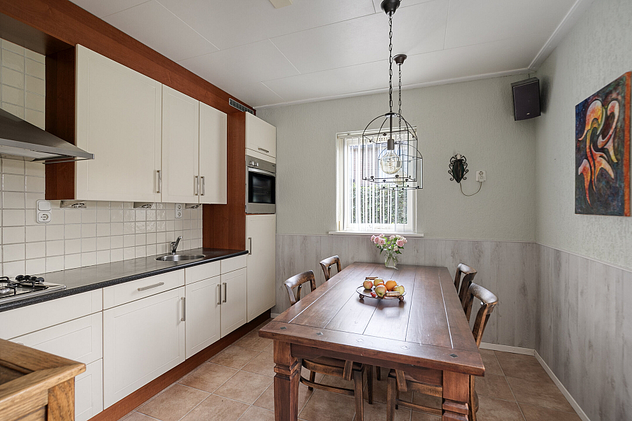 Begane grond: Je betreedt de woning via de entree/hal met trapkast. Hier vind je de toiletruimte met staand toilet en fontein. De woonkamer is licht en sfeervol met een rookkanaal en biedt uitzicht op de tuin en vijverpartij. De keuken is voorzien van praktische inbouwapparatuur, waaronder een 4-pits gaskookplaat, oven, afzuigkap en koelkast. Vanuit de hal is de bijkeuken bereikbaar met wasmachineaansluiting, opstelplaats voor cv-ketel (2024) en een berging, die tevens toegang biedt tot de garage.