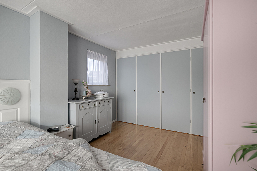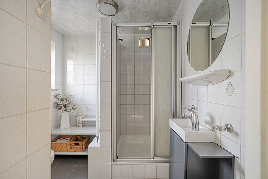 Eerste verdieping: Op de overloop heb je toegang tot drie ruime slaapkamers, elk met toegang naar het balkon aan de voorzijde van de woning. Op deze verdieping vind je veel vaste kasten. De badkamer maakt deze verdieping compleet met douchecabine, vaste wastafel en toilet.