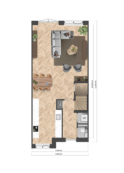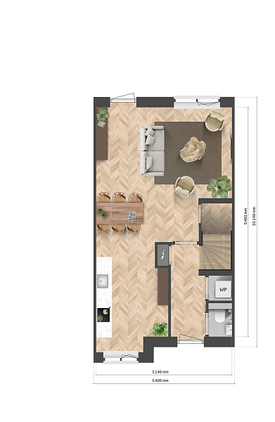 De accentwoning (93&94) van woningmodel Sevenrijck is 5,40 meter breed en 9,54 meter diep. Het accent van 0,6 meter in de voorgevel geeft de woning een stijlvolle uitstraling en zorgt voor extra ruimte voor je nieuwe keuken. Aan de tuinzijde van de woning is ruimte voor een heerlijke zithoek.