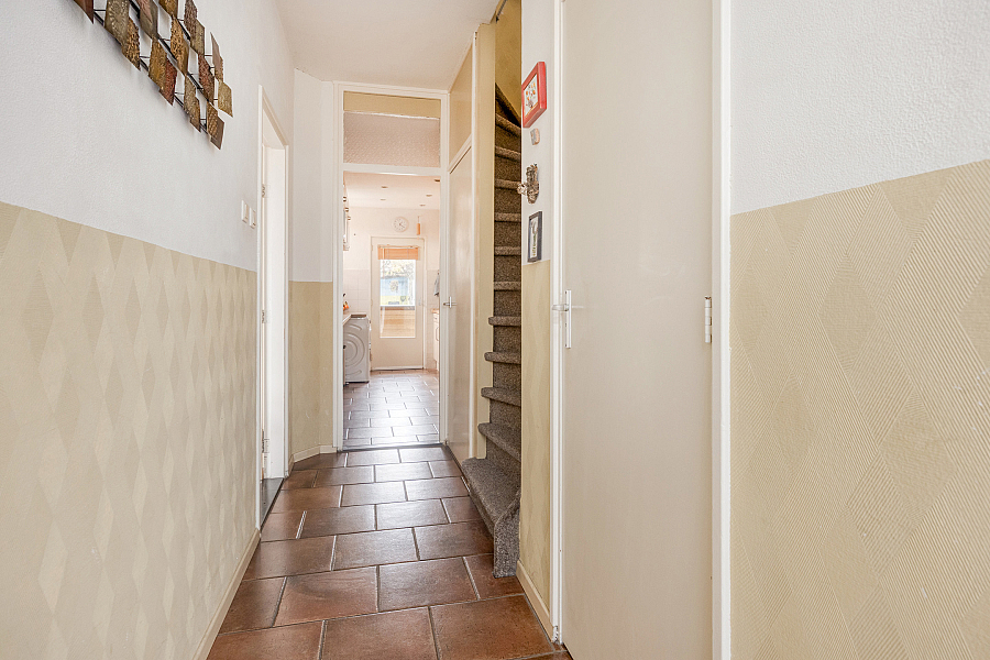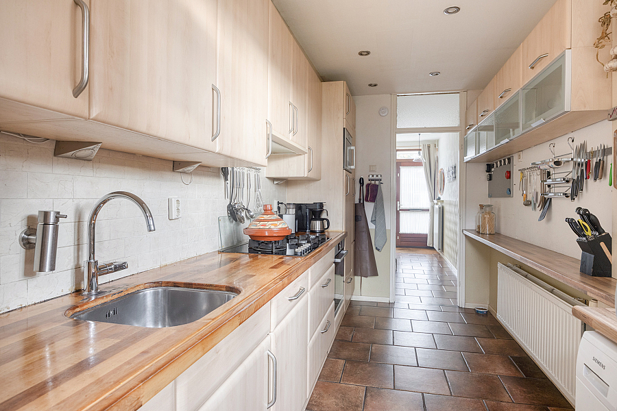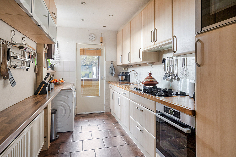 Entree/hal met toiletruimte en praktische kelderkast. De lichte en sfeervolle woonkamer heeft grote raampartijen aan zowel de voor- als achterzijde. De uitgebouwde keuken is compleet uitgerust met diverse inbouwapparatuur, waaronder een 5-pits gaskookplaat, afzuigkap, magnetron, oven, koelkast (2022) en vaatwasser (2020). Tevens bevinden zich hier de aansluitingen voor wasmachine en droger.
