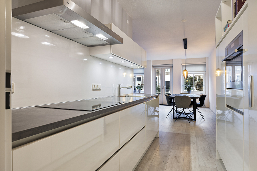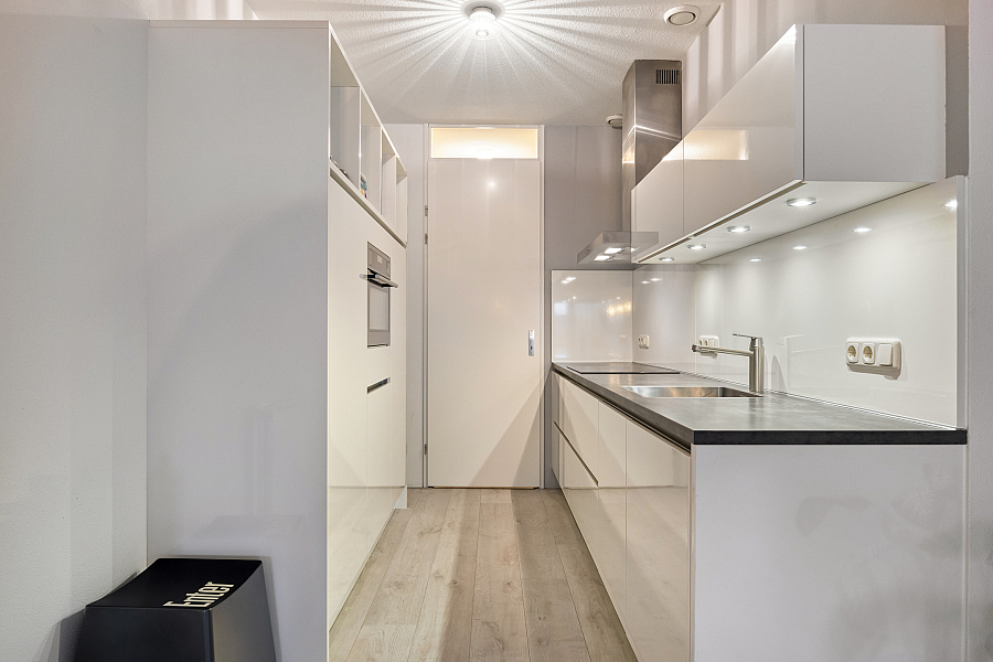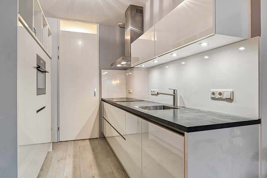 De open woonkeuken (2015) is compleet uitgevoerd met diverse inbouwapparatuur, waaronder een inductiekookplaat, combi-oven, afzuigkap, vaatwasser en koelkast. Aangrenzend bevindt zich een praktische bijkeuken met volop ruimte voor een grote vriezer en extra bergruimte.