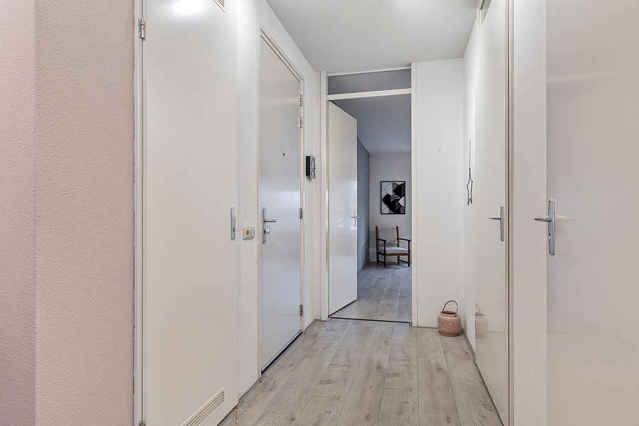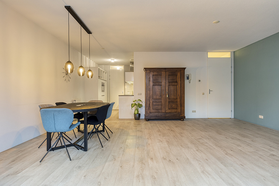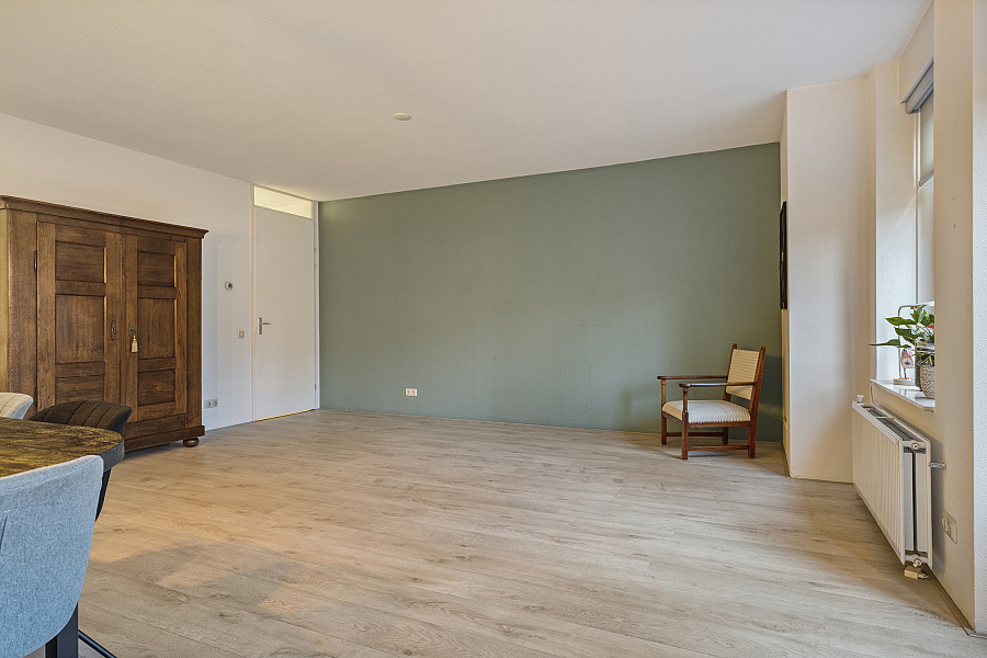 U betreedt het appartement via een ruime hal met garderobekast. De keurig afgewerkte woonkamer aan de voorzijde van het appartement is licht en comfortabel en beschikt over dubbele tuindeuren naar de voortuin. De lichte laminaatvloer draagt bij aan de frisse en moderne uitstraling.