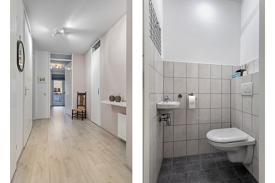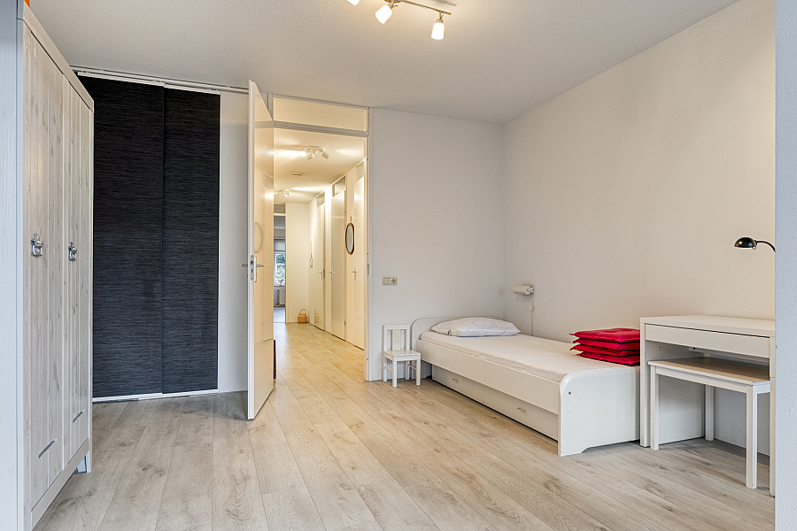Via de hal bereikt u twee royale slaapkamers, beide voorzien van vaste kastenwanden. Eén van de slaapkamers biedt direct toegang tot het terras aan de achterzijde. Verder vindt u hier een inpandige berging met opstelplaats voor de cv-ketel en wasmachine, een moderne badkamer (2015) met douchehoek en wastafelmeubel, en een separaat toilet met fontein.