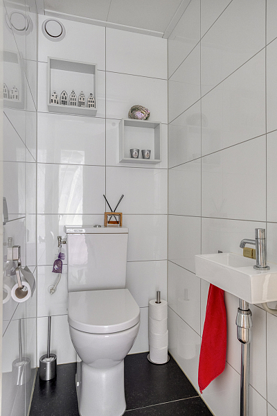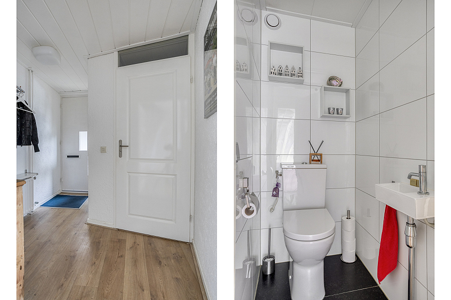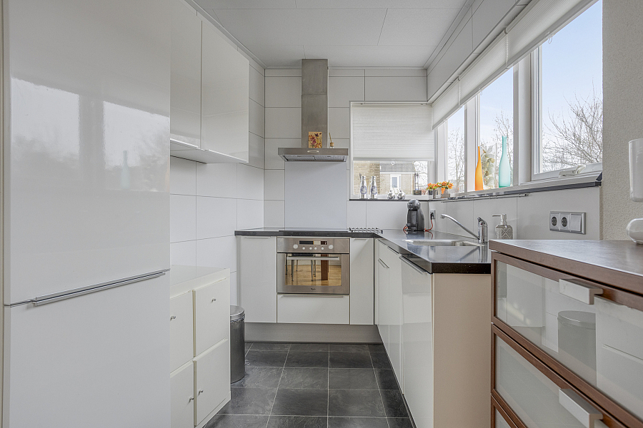Overdekte entree met vernieuwde meterkast, toiletruimte met hangend toilet en fontein, straatgerichte open keuken met composiet werkblad en inbouwapparatuur ( o.a. keramische kookplaat, afzuigkap, koel/vrieskast, combi-magnetron en vaatwasser), ruime eethoek aan de voorzijde van de woning.