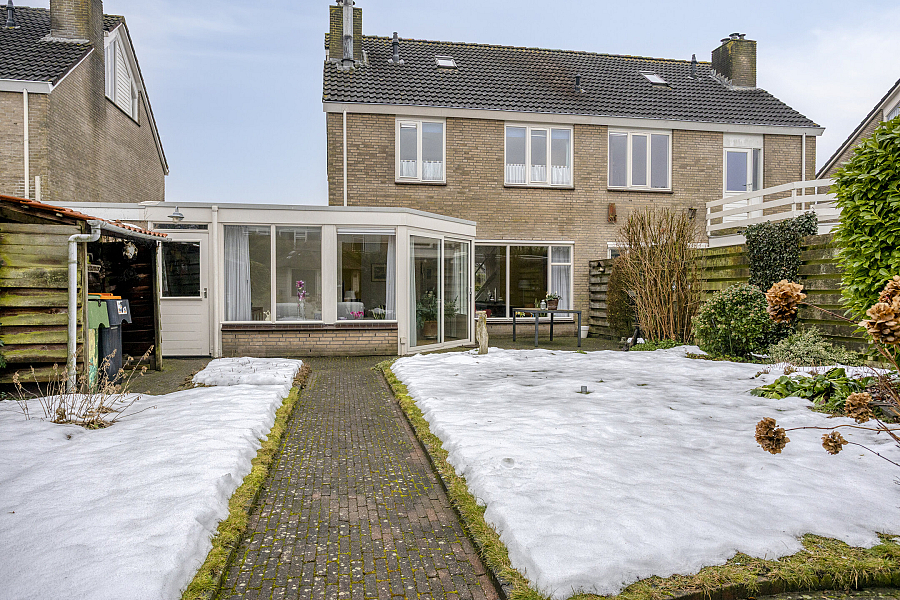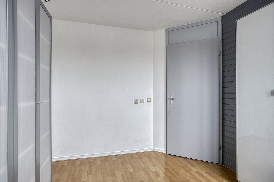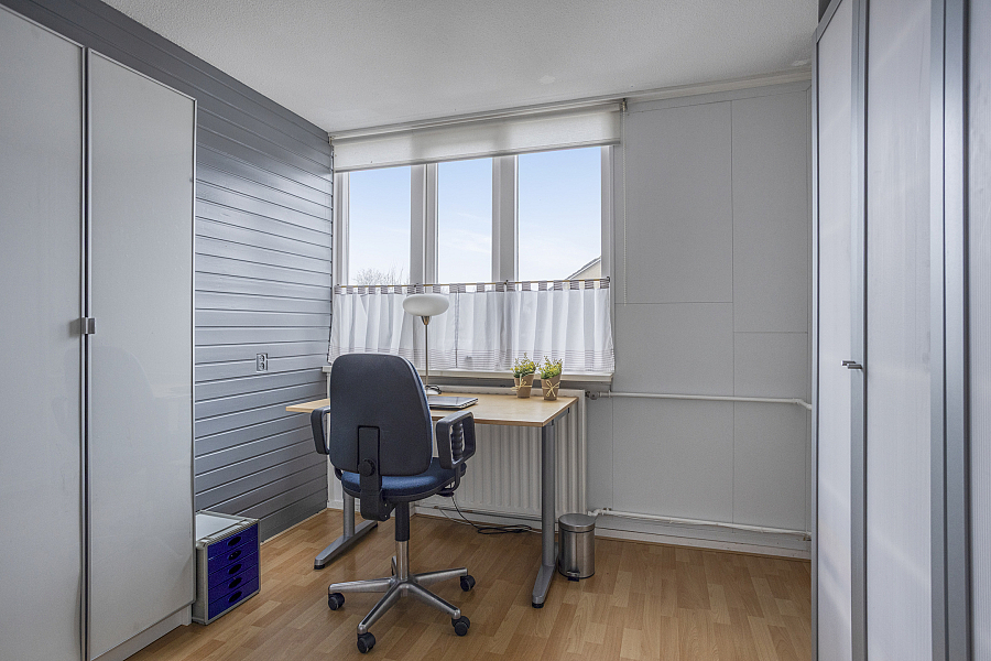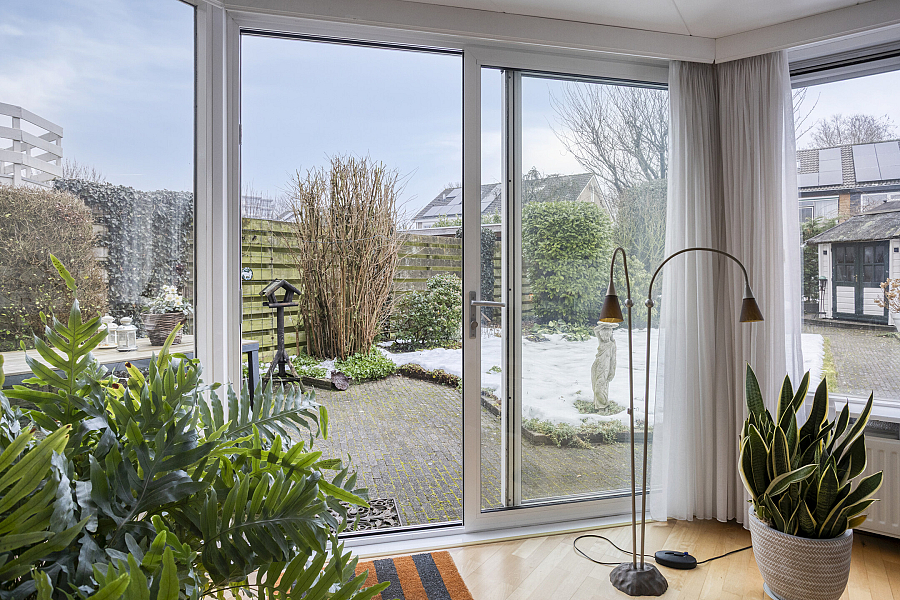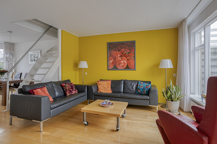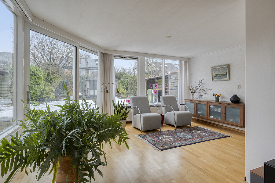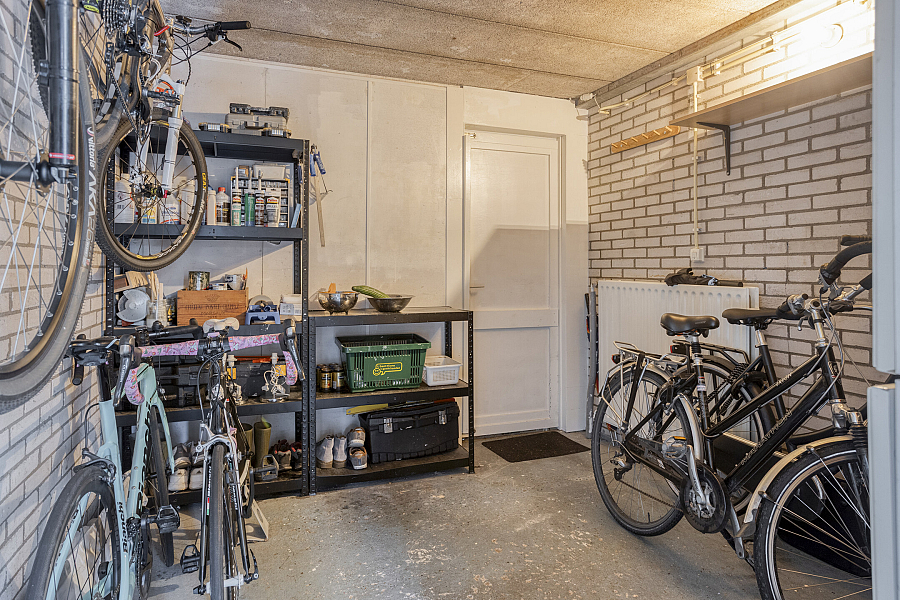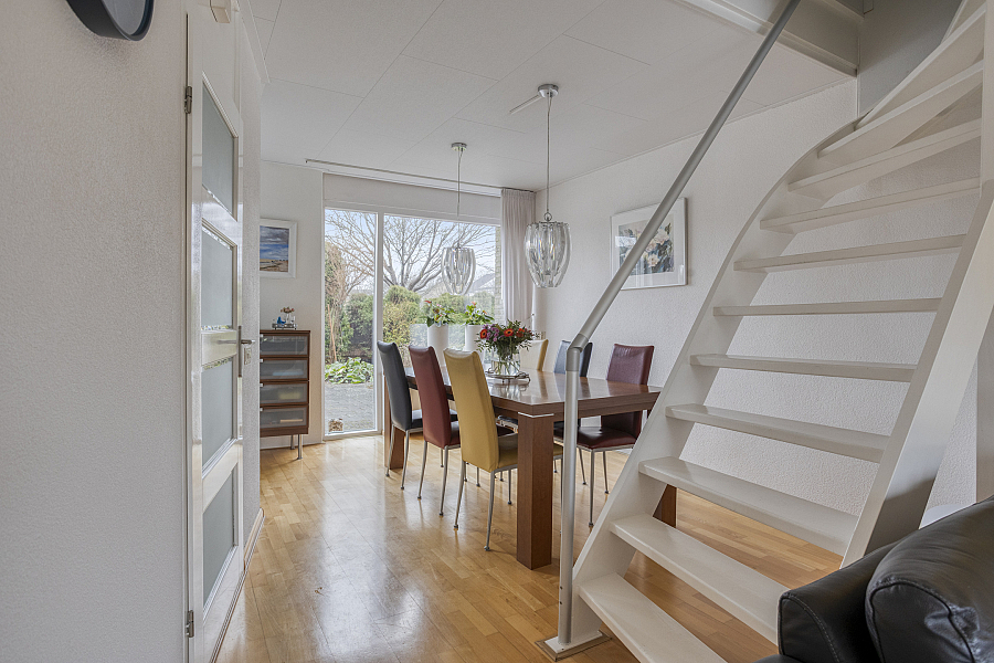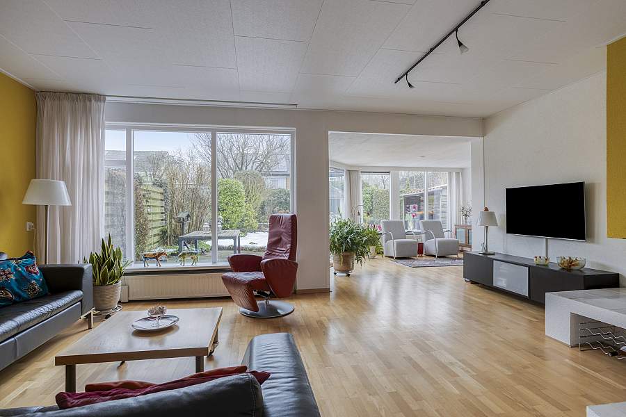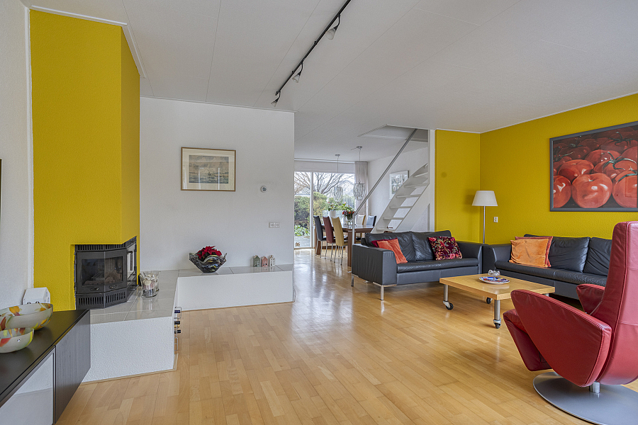 De heerlijk lichte en ruime woonkamer is uitgebouwd en is voorzien van een kunststof schuifpui, een massief essen parketvloer en een sfeervolle houtkachel. Door de indeling en zijn er meerdere zithoeken met mogelijkheid voor bijvoorbeeld een ruime speelhoek, werkplek etc. Doorgang naar de ruime berging met inpandige achterom naar de achtertuin.