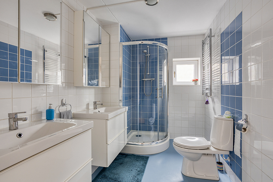 Overloop, 3 ruime slaapkamers van circa 9m2, 10m2 en 17m2 waarbij de grootste slaapkamer is voorzien van een vaste kastenwand, moderne badkamer met 2 wastafelmeubels, douchecabine en 2e toilet, vaste trap naar ...