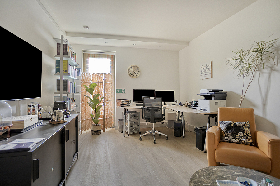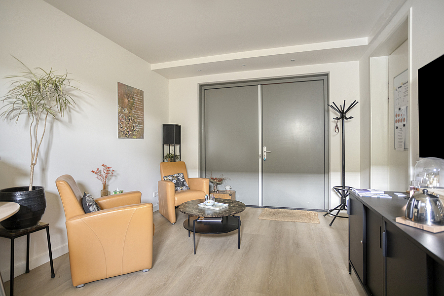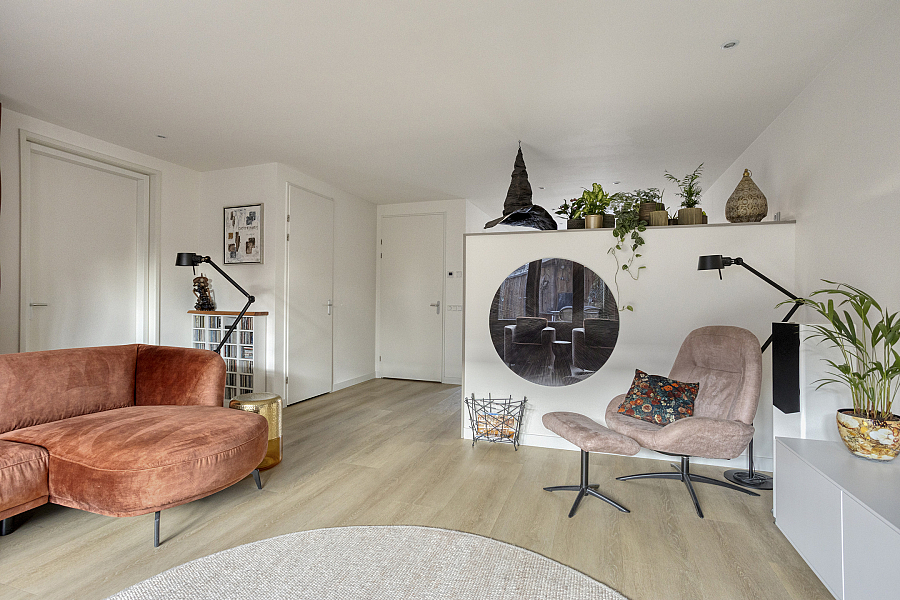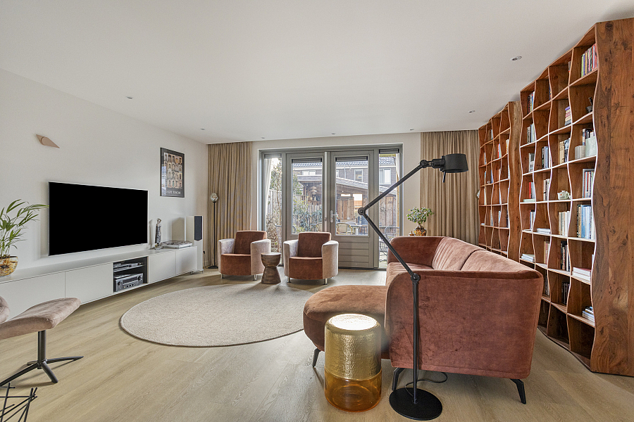 De uitgebouwde, tuingerichte woonkamer biedt volop ruimte en licht en staat in directe verbinding met een aangrenzende slaap- of werkkamer (voormalige garage) op de begane grond – ideaal voor gelijkvloers wonen, thuiswerken of een praktijk aan huis.