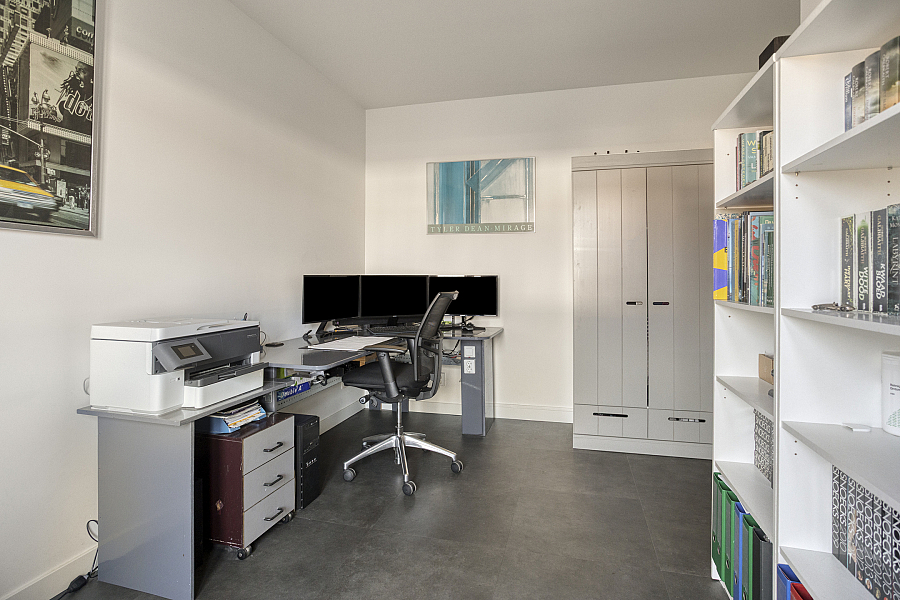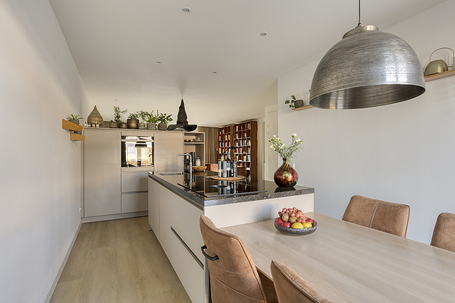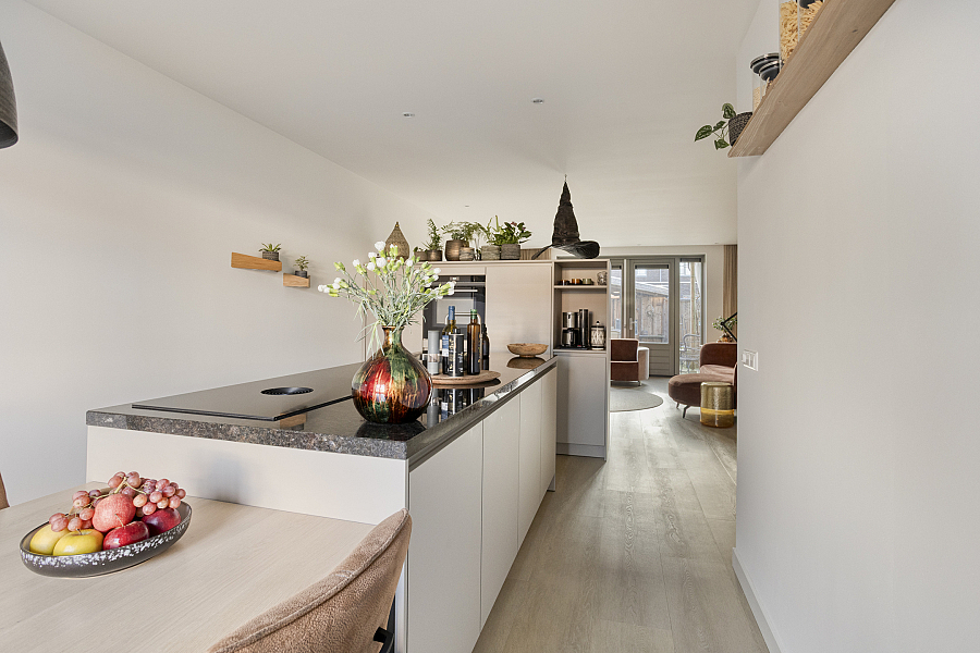 Je stapt binnen in een ruime hal met modern toilet en een zeer uitgebreide groepenkast inclusief krachtstroom. Aan de straatzijde vind je de luxe Siematic open keuken, een echte eyecatcher met hoogwaardige inbouwapparatuur en een stijlvol granieten werkblad. Hier kook je met plezier terwijl je uitkijkt over de straat.