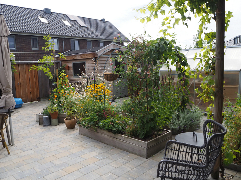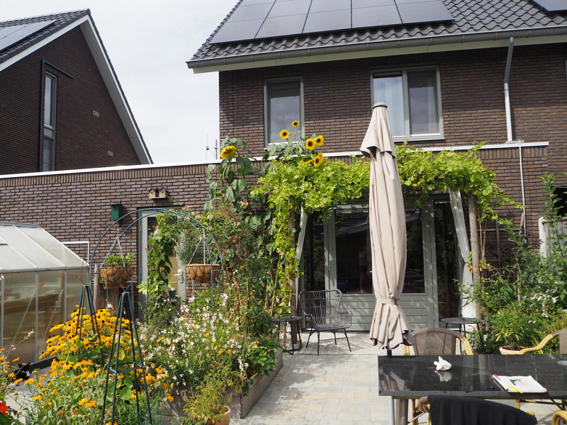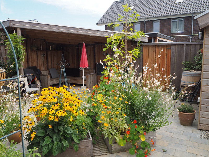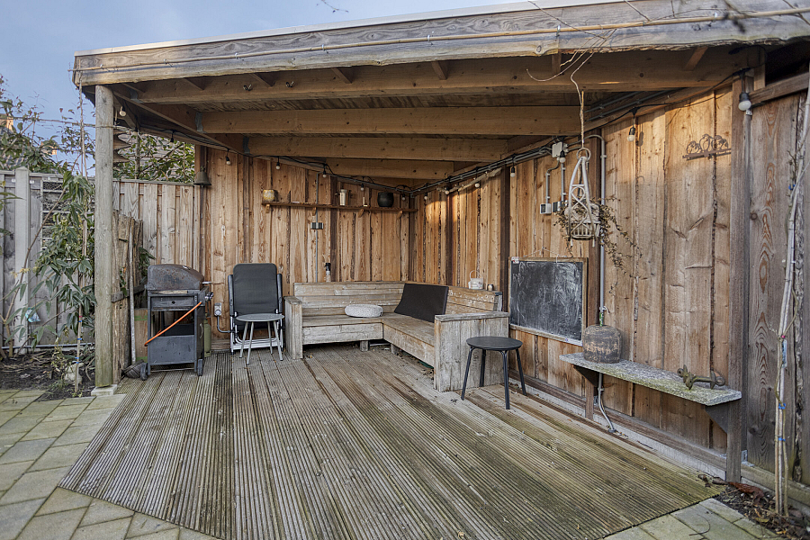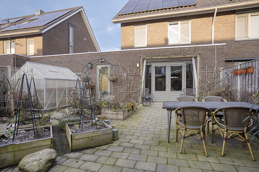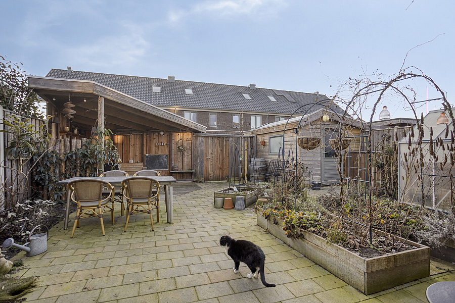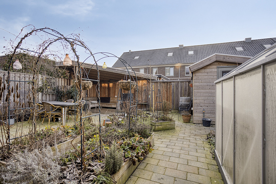 Buiten geniet je van een fraai aangelegde tuin die in de zomer verandert in een groene oase met een grote variatie aan planten. Achterin staat een vrijstaande houten berging, en dankzij de brede achterom is de tuin ook praktisch in gebruik. Op je eigen oprit is plaats voor twee auto’s.