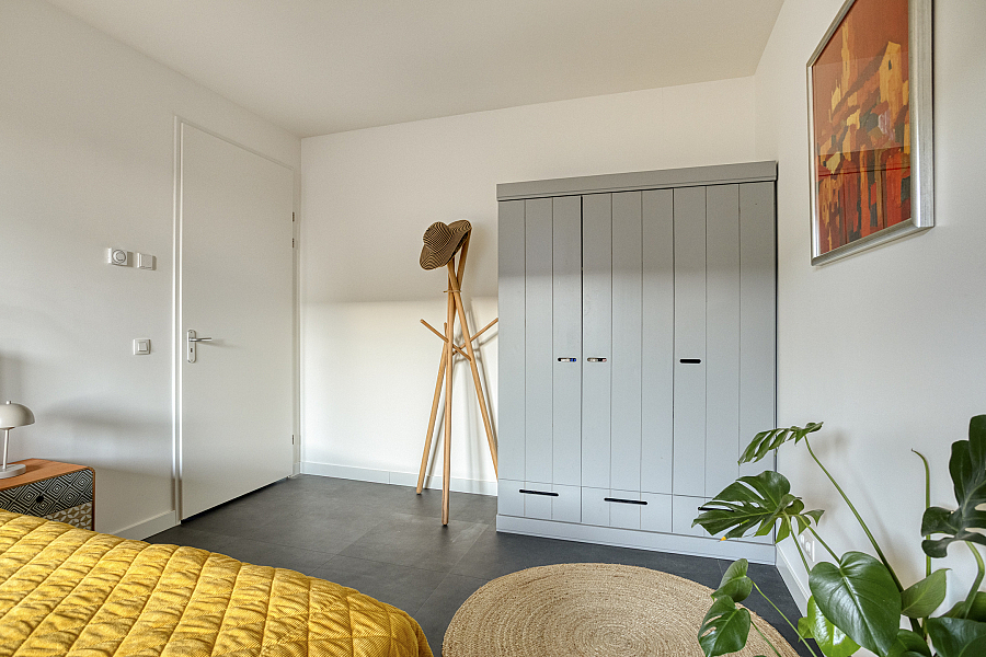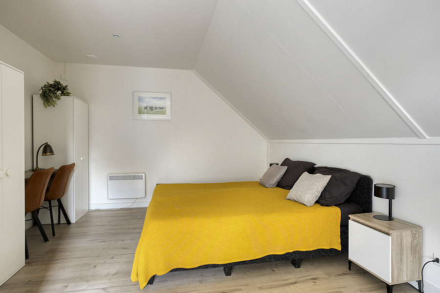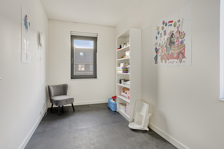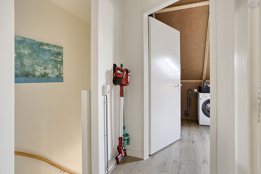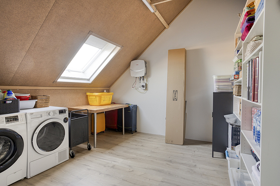 Via een dichte trap bereik je de tweede verdieping, waar je een ruime vierde slaapkamer vindt en de opstelplaats voor de warmtepomp, boiler en omvormer van de zonnepanelen.