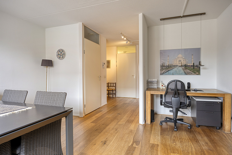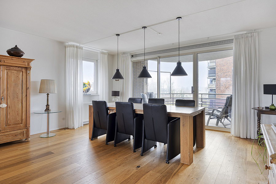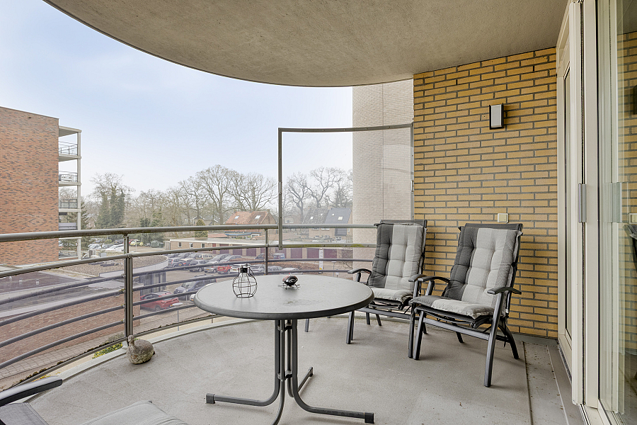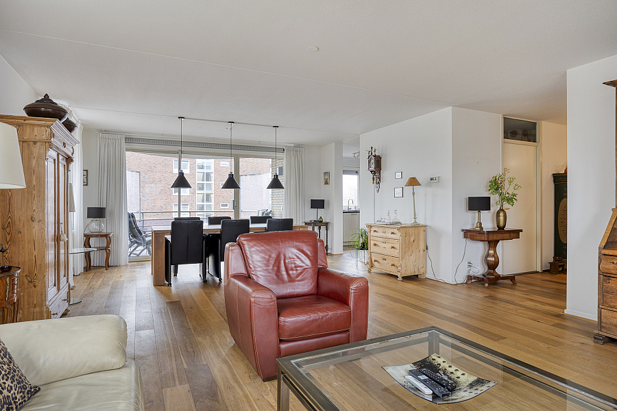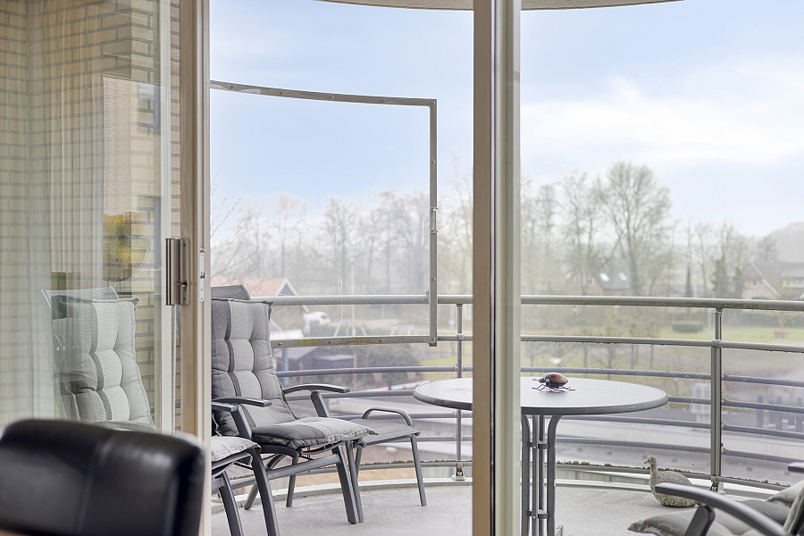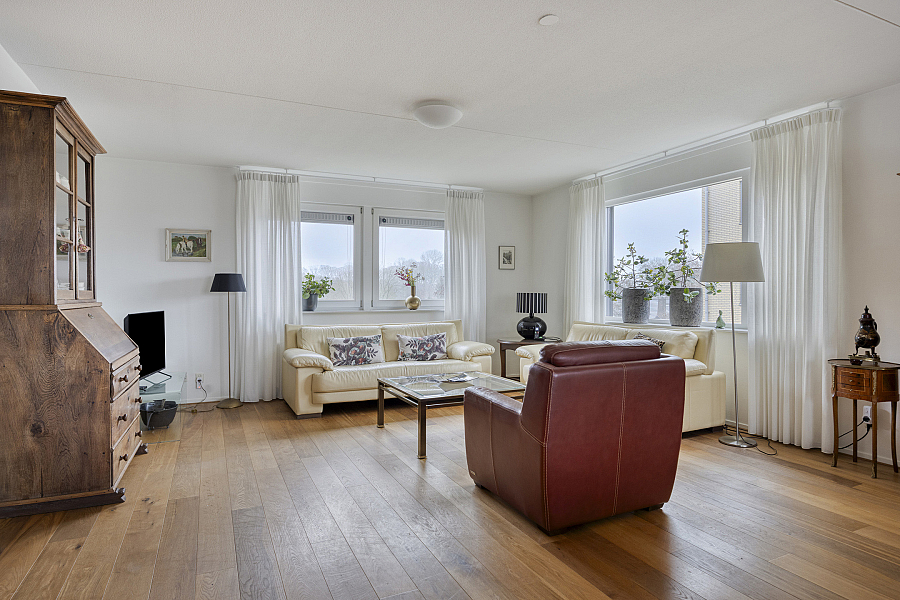 Entree, ruime hal met toegang tot lichte woonkamer (circa 45 m2) met ruim balkon gelegen op het zuiden en uitzicht over de landerijen, halfopen keuken (2013) voorzien van diverse inbouwapparatuur (o.a. inductie kookplaat, koelkast, vaatwasser, afzuigkap, combi-magnetron), bijkeuken met wasmachineaansluiting en cv-ruimte, 2 royale slaapkamers (eenvoudig weer terug te brengen tot 3 slaapkamers), ruime badkamer voorzien van inloopdouche, ligbad, dubbele wastafel en 2e toilet. De slaapkamers gelegen op de zuidkant zijn voorzien van elektrische screens. Tevens is het volledige appartement voorzien van mooie houten vloerdelen.