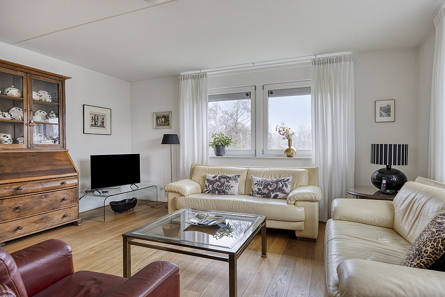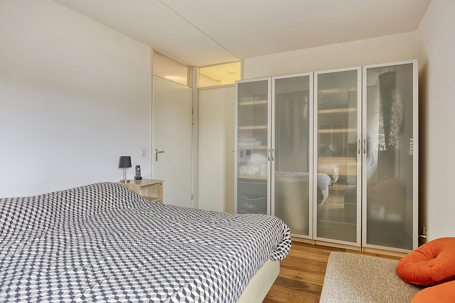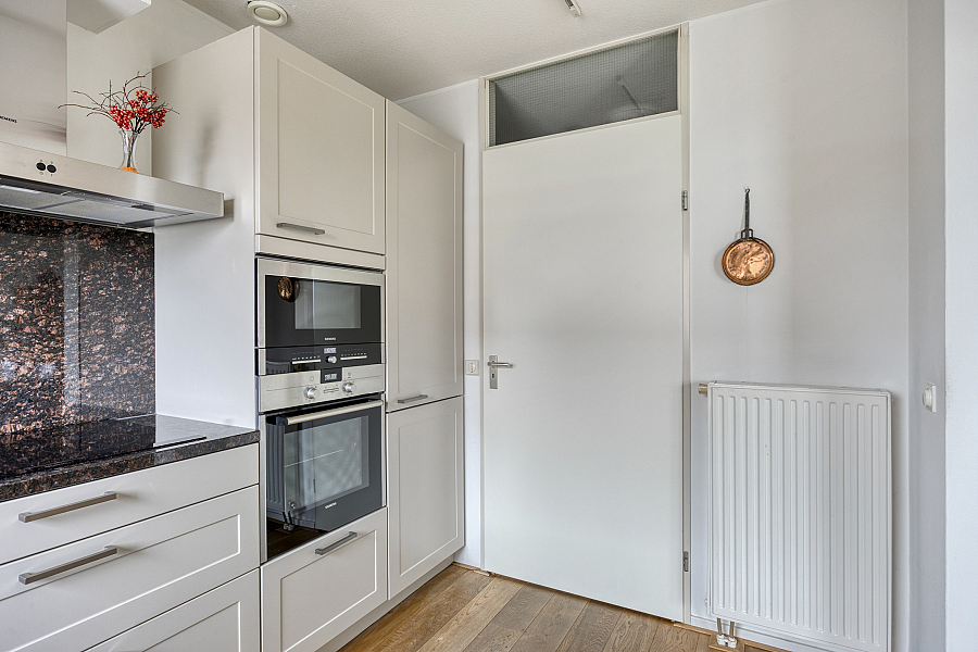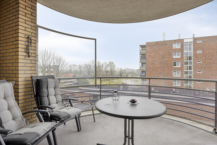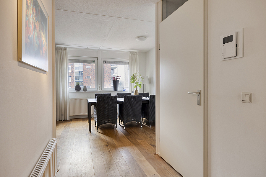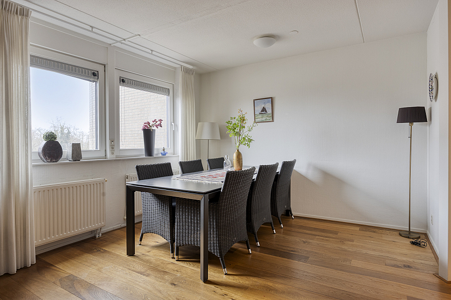 Entree, ruime hal met toegang tot lichte woonkamer (circa 45 m2) met ruim balkon gelegen op het zuiden en uitzicht over de landerijen, halfopen keuken (2013) voorzien van diverse inbouwapparatuur (o.a. inductie kookplaat, koelkast, vaatwasser, afzuigkap, combi-magnetron), bijkeuken met wasmachineaansluiting en cv-ruimte, 2 royale slaapkamers (eenvoudig weer terug te brengen tot 3 slaapkamers), ruime badkamer voorzien van inloopdouche, ligbad, dubbele wastafel en 2e toilet. De slaapkamers gelegen op de zuidkant zijn voorzien van elektrische screens. Tevens is het volledige appartement voorzien van mooie houten vloerdelen.
