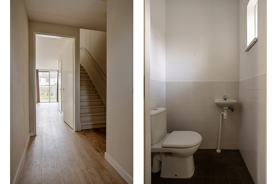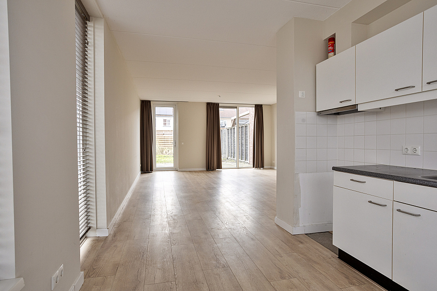 BEGANE GROND: Entree/hal met toiletruimte en trapopgang naar de eerste verdieping, straatgerichte open keuken met eenvoudig keukenblok met afzuigkap, tuingerichte woonkamer met deur naar de achtergelegen zonnige tuin op het zuidwesten.