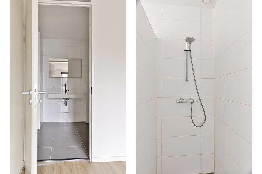 De badkamer is keurig afgewerkt en voorzien van een inloopdouche, wastafel en een tweede toilet.