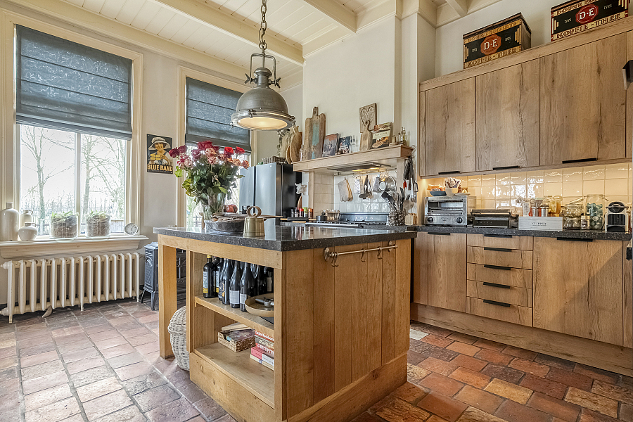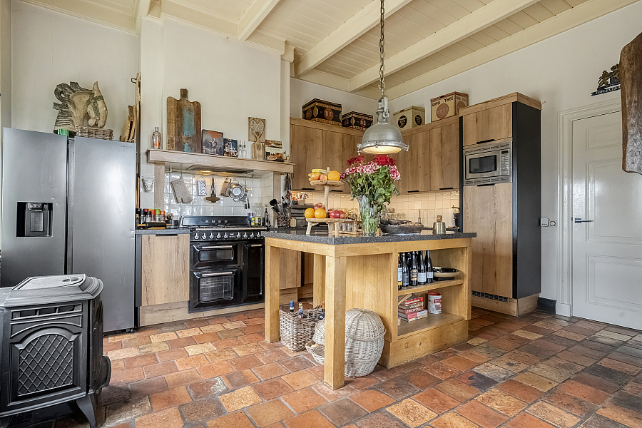 Gezellige woonkeuken met openslaande deuren naar buiten, werkeiland, granieten werkbladen en uitgebreide inbouwapparatuur, waaronder een Smeg-fornuis met maar liefst drie ovens en een afzuigschouw. Hier vindt u deels massief houten vloerdelen en deels een karakteristieke estriken vloer.