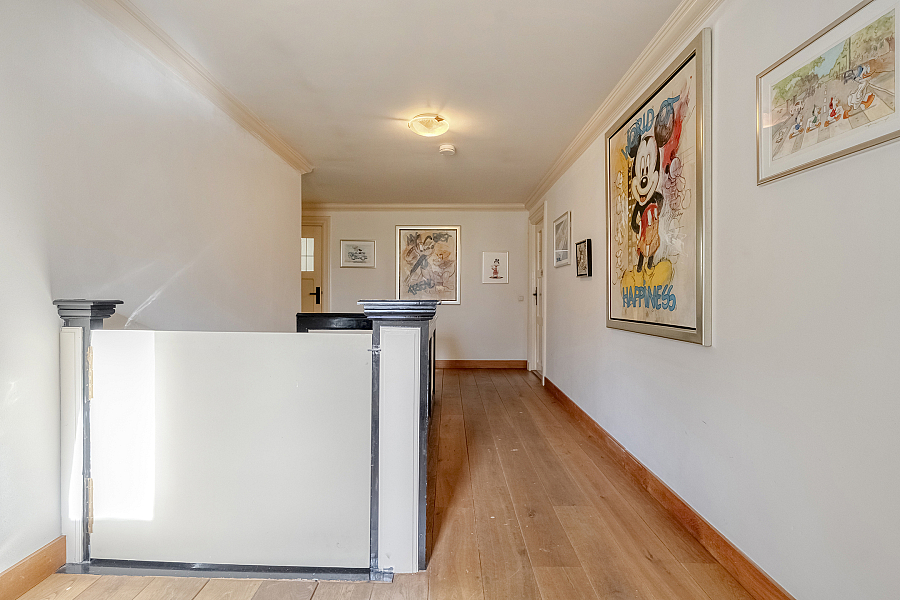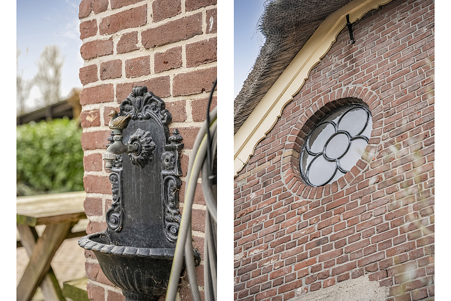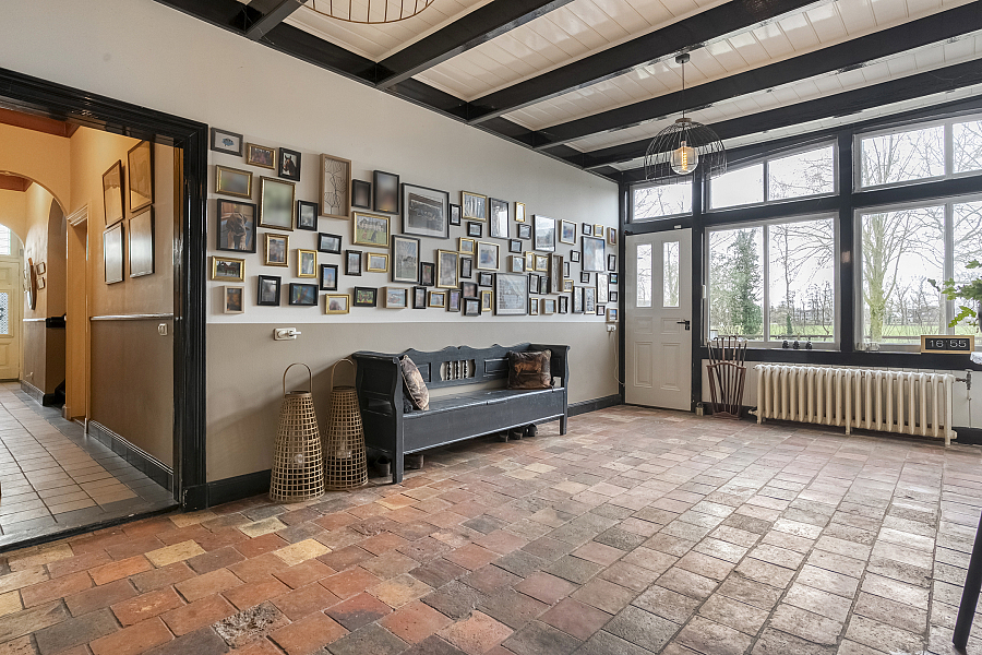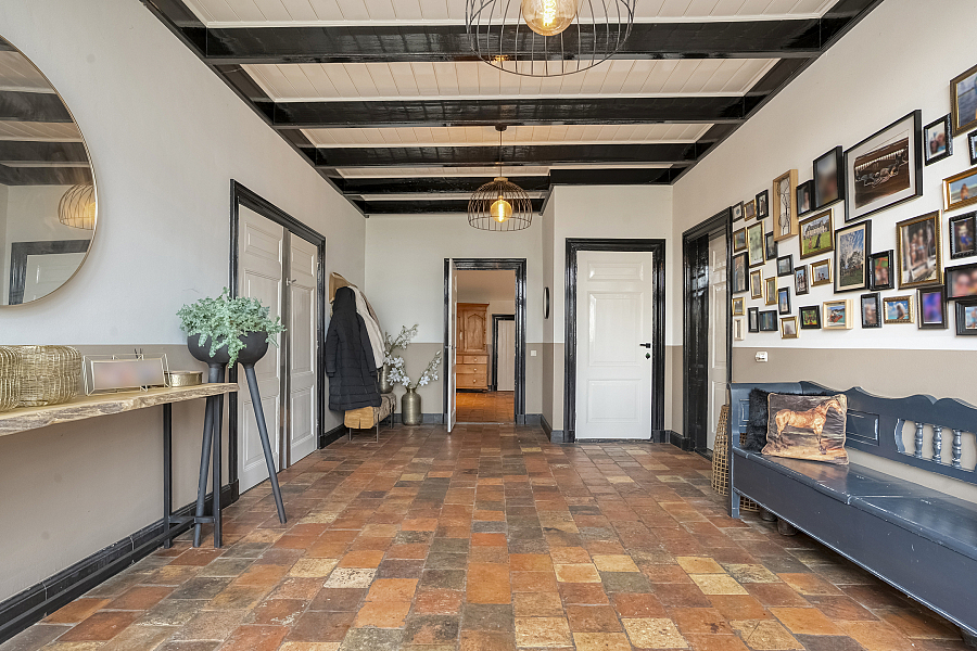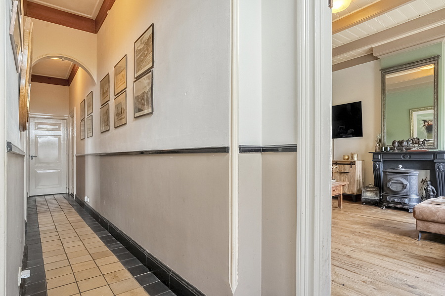 De boerderij ademt karakter dankzij prachtige originele details zoals glas-in-loodramen, paneeldeuren en massief houten vloerdelen. De imposante entree vormt het hart van de woning en geeft toegang tot zowel het voorhuis als de riante deelruimte.