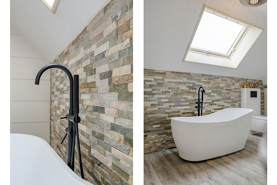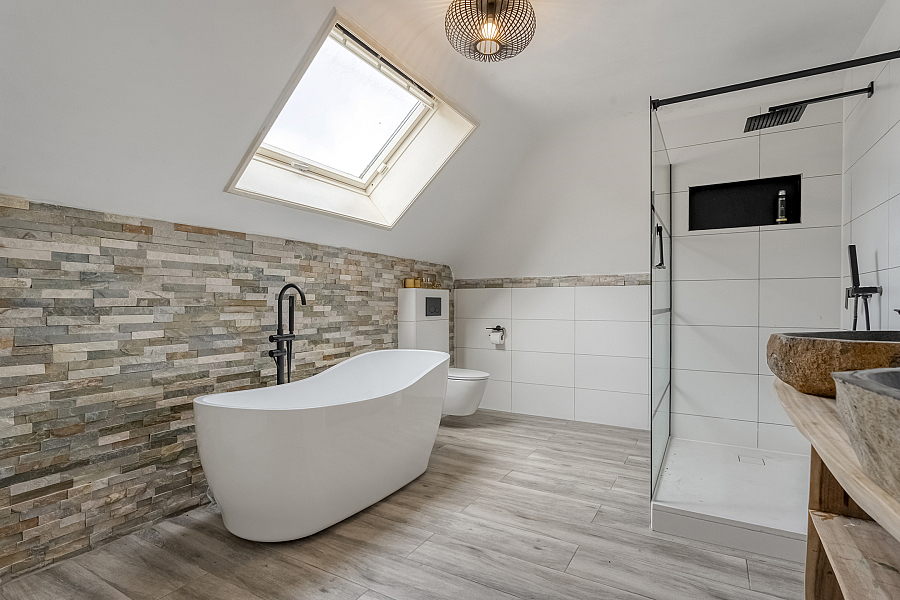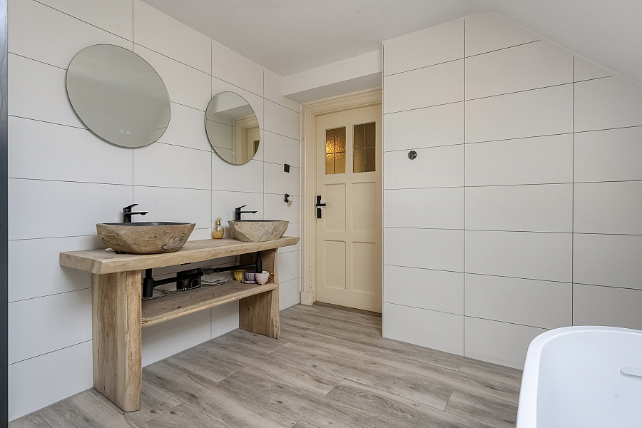 Via een vaste trap in het voorhuis komt u op de overloop met karakteristieke dakkapellen en prachtig uitzicht over de omliggende landerijen. Hier bevinden zich 2 slaapkamers (meer kamers mogelijk) en een badkamer met vrijstaand ligbad, douchehoek, dubbel wastafelmeubel en toilet.