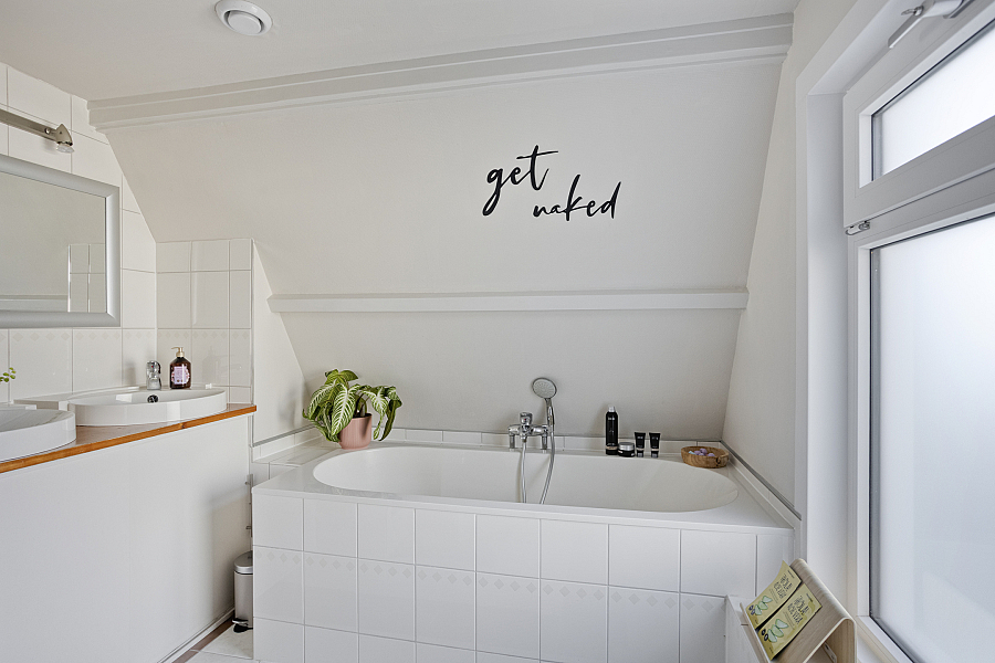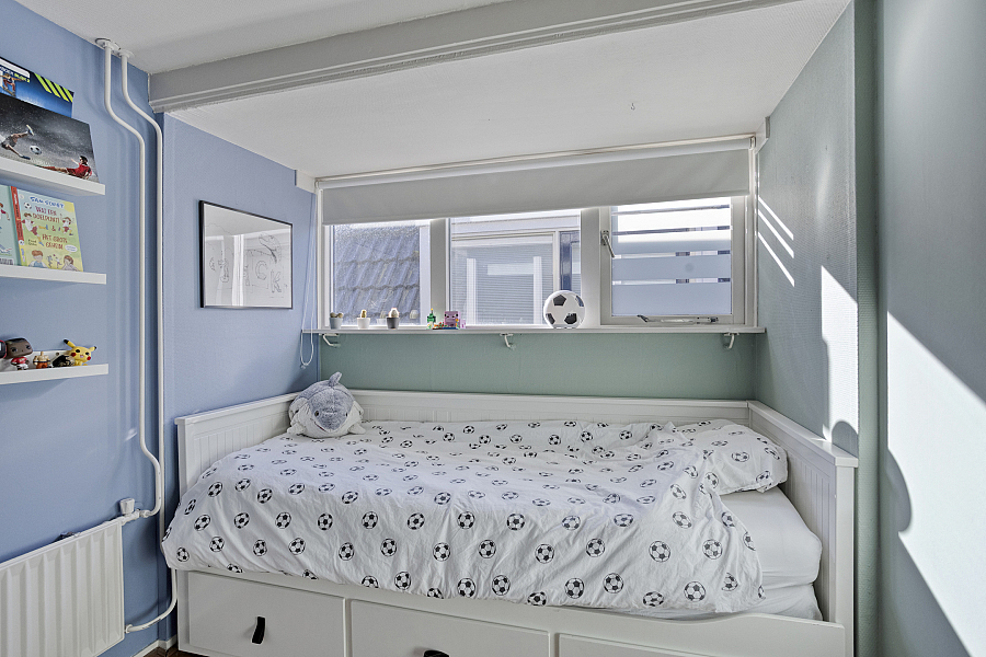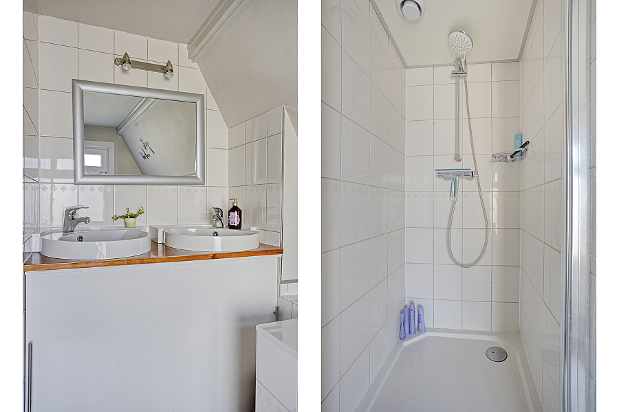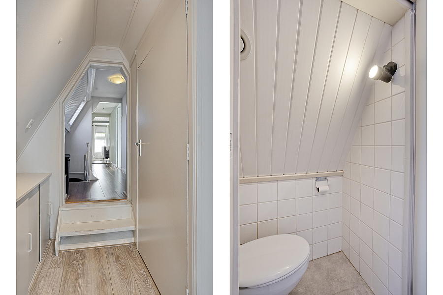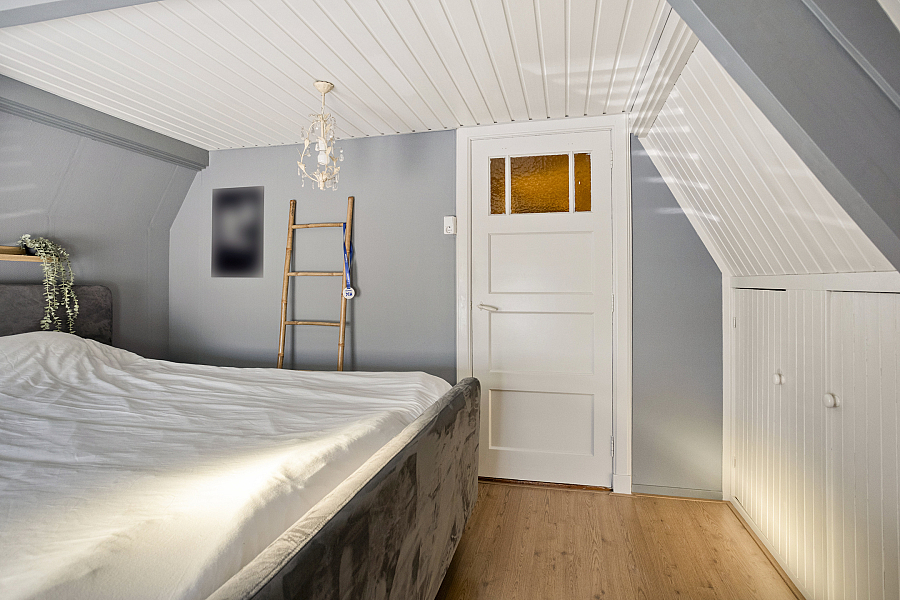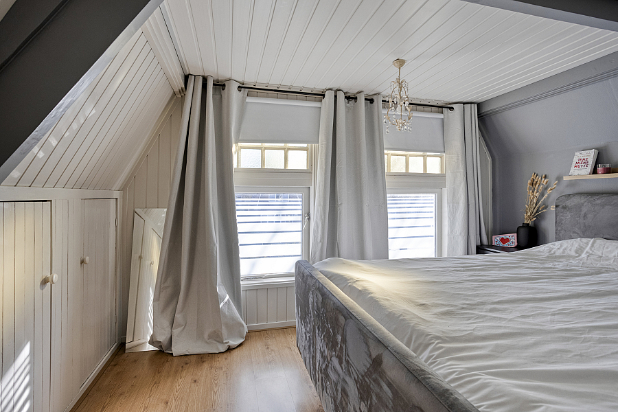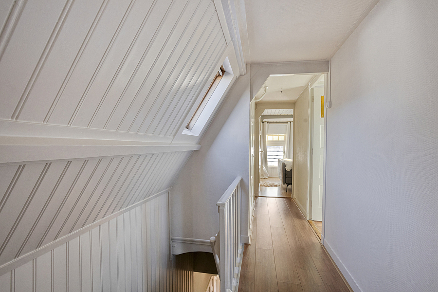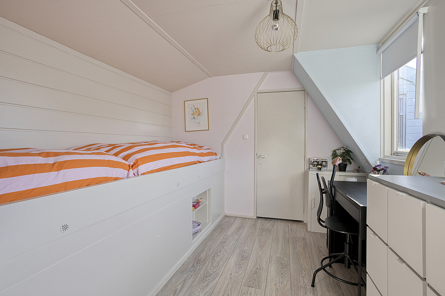 Overloop met vaste kasten, slaapkamer 1 aan de voorzijde met vaste kastjes (knieschotten), slaapkamer 2 en de badkamer zijn vergroot middels een dakkapel v.v. ligbad, douche en dubbele wastafel. Boven de aanbouw een toilet en slaapkamer 3 met een vaste bed ombouw.