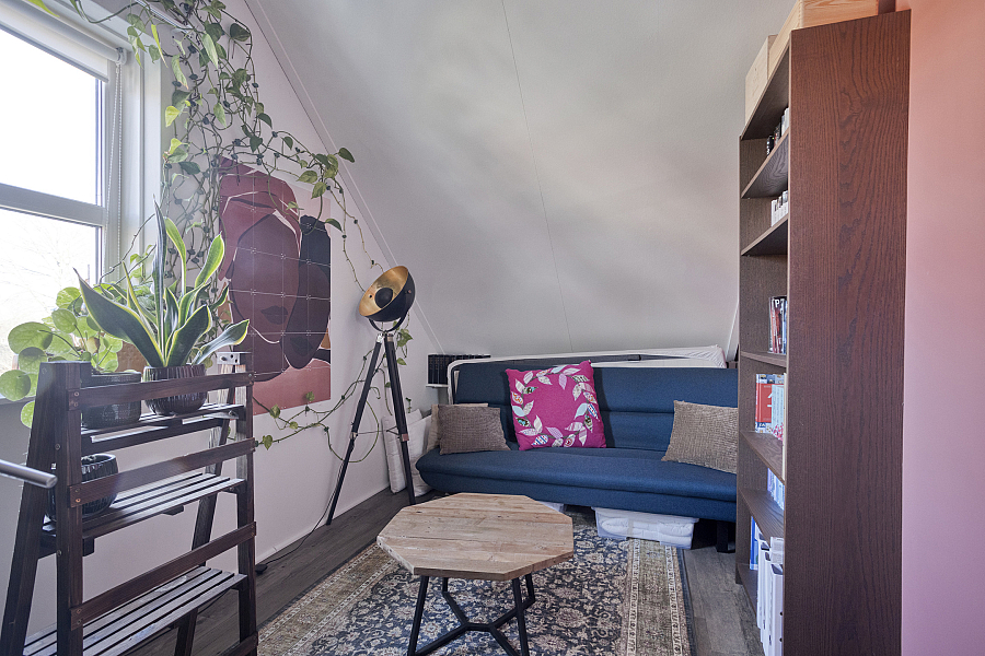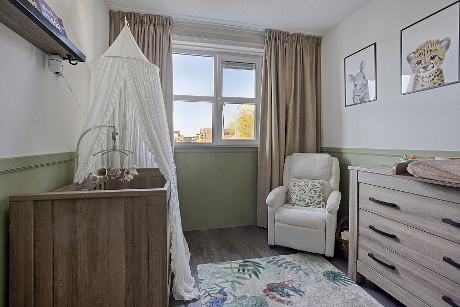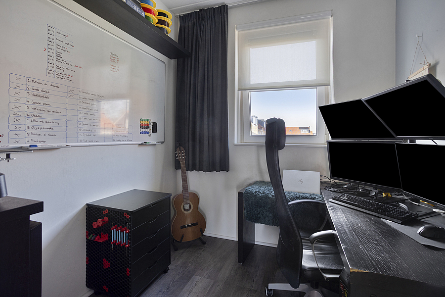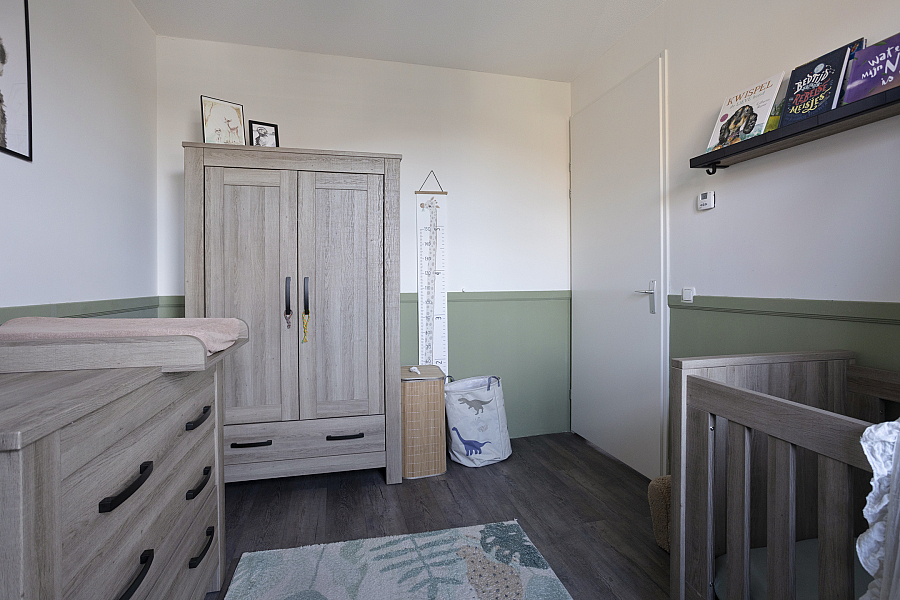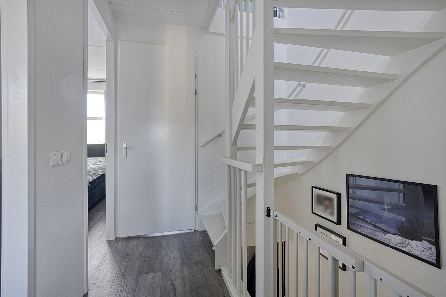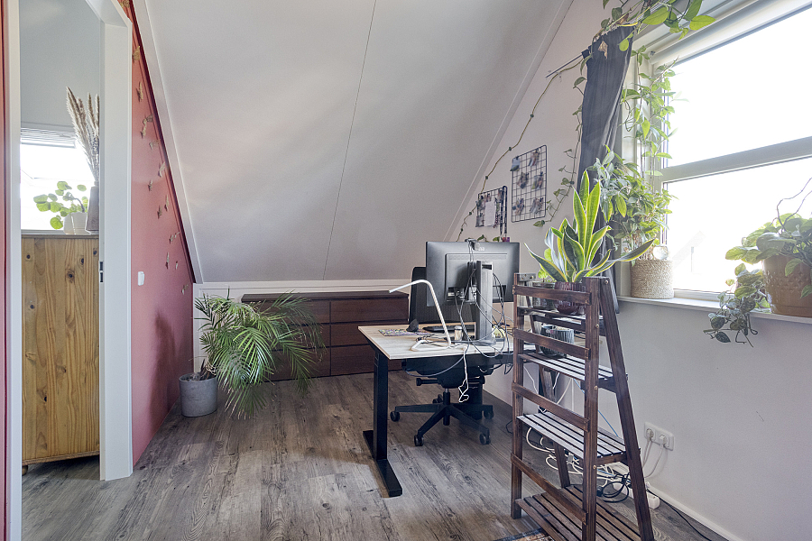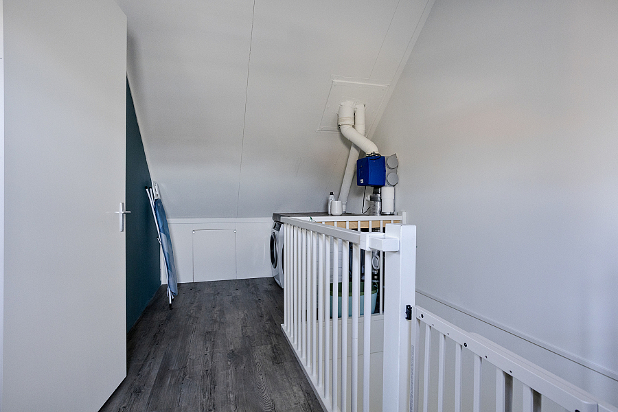 De tweede verdieping biedt een ruime vierde slaapkamer. Op de voorzolder vind je de aansluitingen voor wasmachine en droger, de mechanische ventilatiebox, knieschotten voor extra bergruimte en een Velux dakraam voor prettig daglicht.