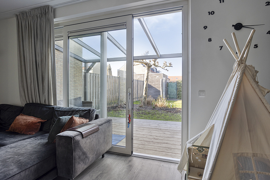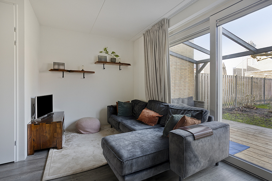 De tuingerichte woonkamer is licht en ruim en biedt via een loopdeur direct toegang tot de achtertuin.