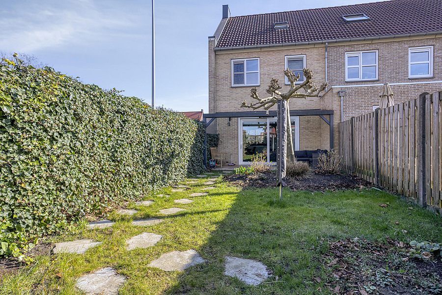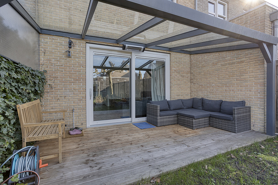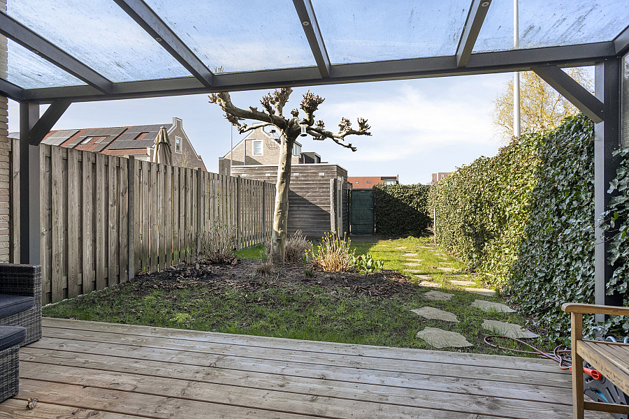 De verzorgde achtertuin is gelegen op het noordwesten, waardoor je hier optimaal kunt genieten van de zon in de middag en avond. Aan de achtergevel van de woning bevindt zich een fraaie overkapping, ideaal voor lange zomeravonden. Daarnaast is er een houten berging en een handige achterom. Direct achter de woning ligt een openbare parkeerplaats.