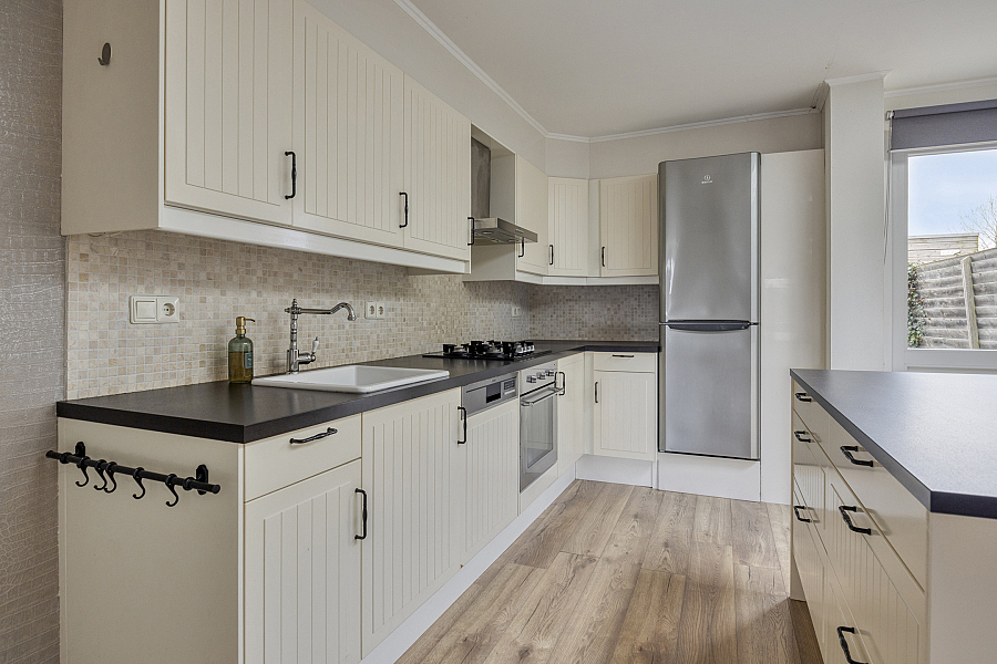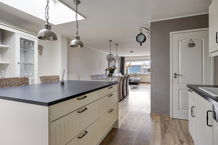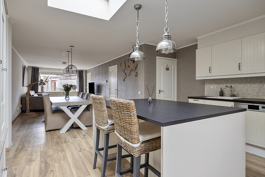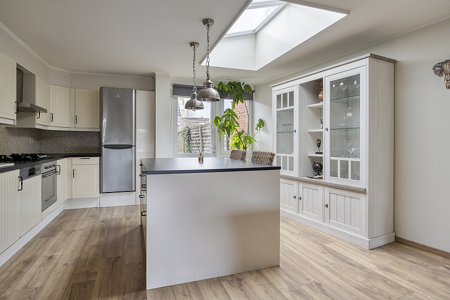 Deze woning biedt een fijne combinatie van ruimte en comfort. De uitgebouwde woonkeuken vormt het hart van het huis en is voorzien van alle gemakken. Denk aan een vaatwasser, oven, 4-pits gaskookplaat en een koel-vriescombinatie. Het eiland met bar maakt het een ideale plek om te koken én gezellig samen te zijn. Daarnaast beschikt de keuken over een handige voorraadkast. De begane grond is verder uitgerust met een ruim en modern toilet.