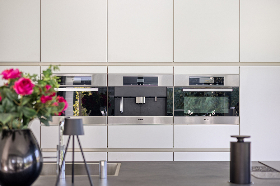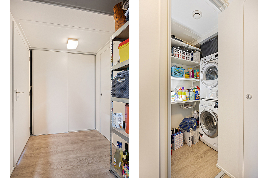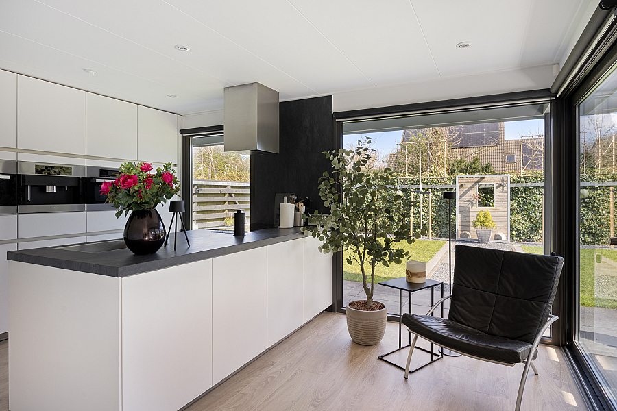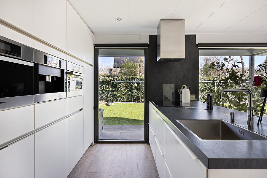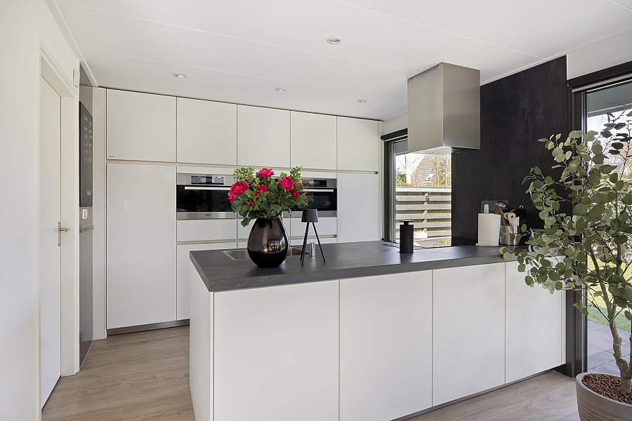 De woonkeuken is in 2024 deels vernieuwd en uitgerust met diverse inbouwapparatuur zoals een inductiekookplaat, afzuigkap, Quooker, koffiemachine, oven/stoomoven en vaatwasser. Het keramische werkblad geeft het geheel een luxe uitstraling. Aansluitend bevinden zich de bijkeuken met wasmachine- en drogeraansluiting, de technische ruimte en de doorgang naar de ruime garage.
