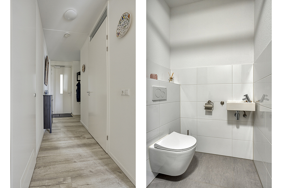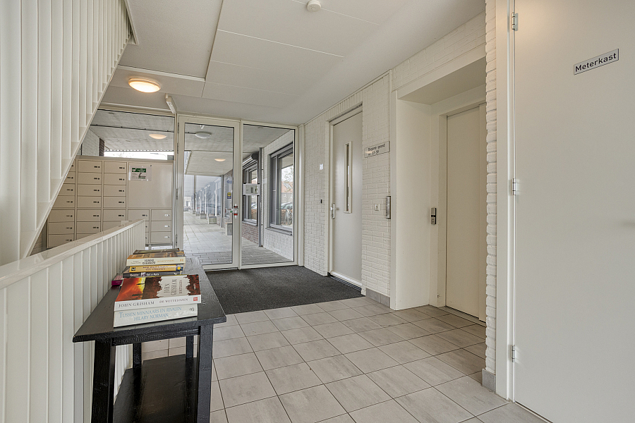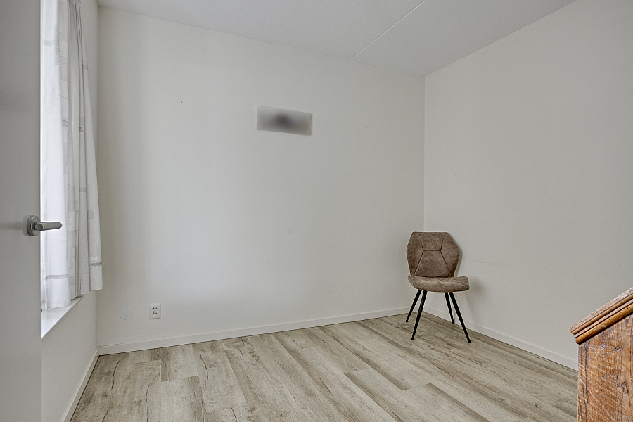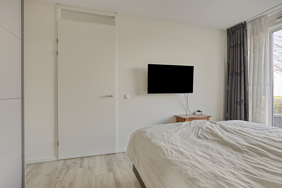 Het appartement beschikt over twee slaapkamers, ideaal als hoofdslaapkamer en bijvoorbeeld een werk- of logeerkamer. Daarnaast is er een praktische bijkeuken/berging met wasmachineaansluiting. De badkamer is netjes afgewerkt en voorzien van een douche, wastafel en tweede toilet.