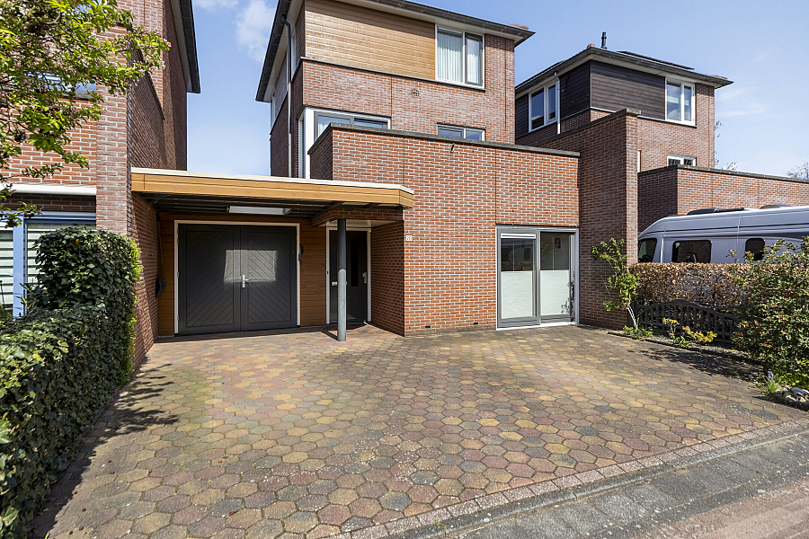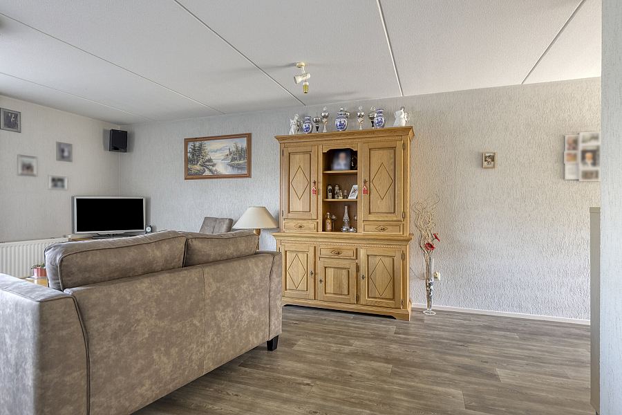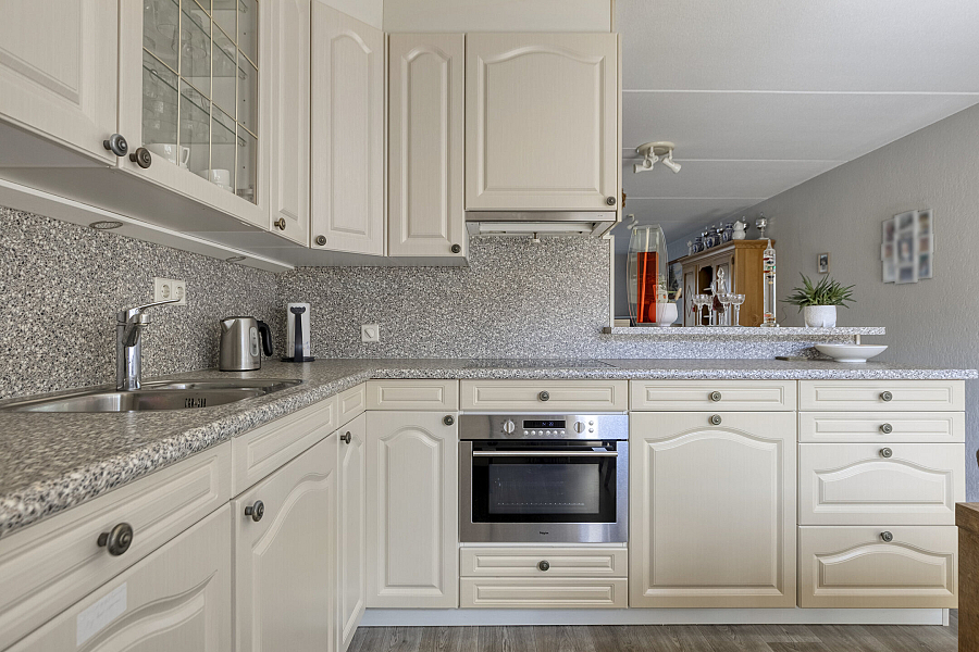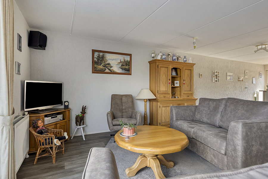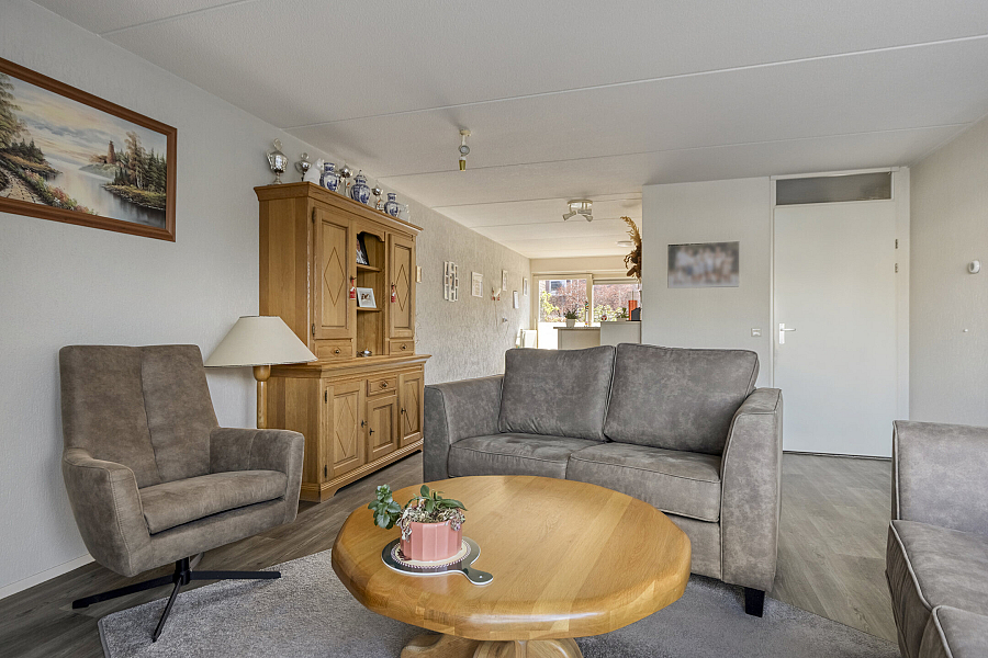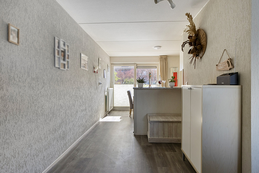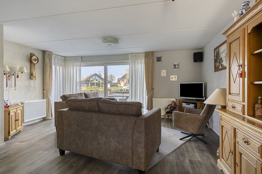 Entree met binnendoor te bereiken garage en toilet, water gerichte woonkamer met vaste kast, marmoleum vloerbedekking (ook in entree en keuken) en schuifpui naar de onderhoudsvriendelijke tuin, open keuken met schuifpui naar terras aan de voorzijde, hoekkeuken voorzien van kunststof werkblad, inbouwspotjes en inbouwapparatuur als inductie kookplaat, vaatwasser, oven, koelkast, afzuigschouw.