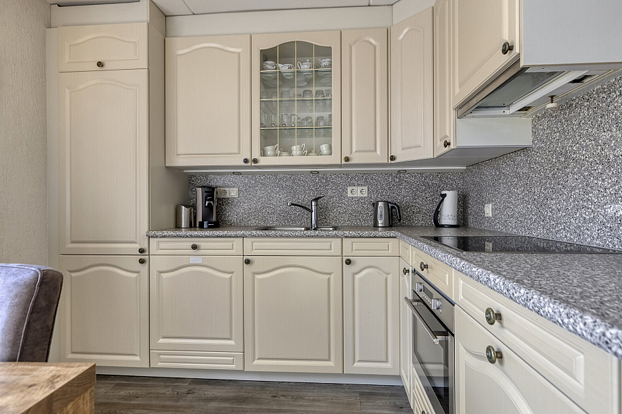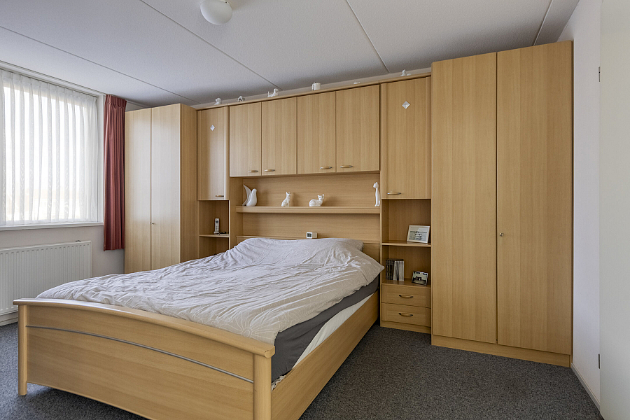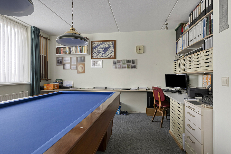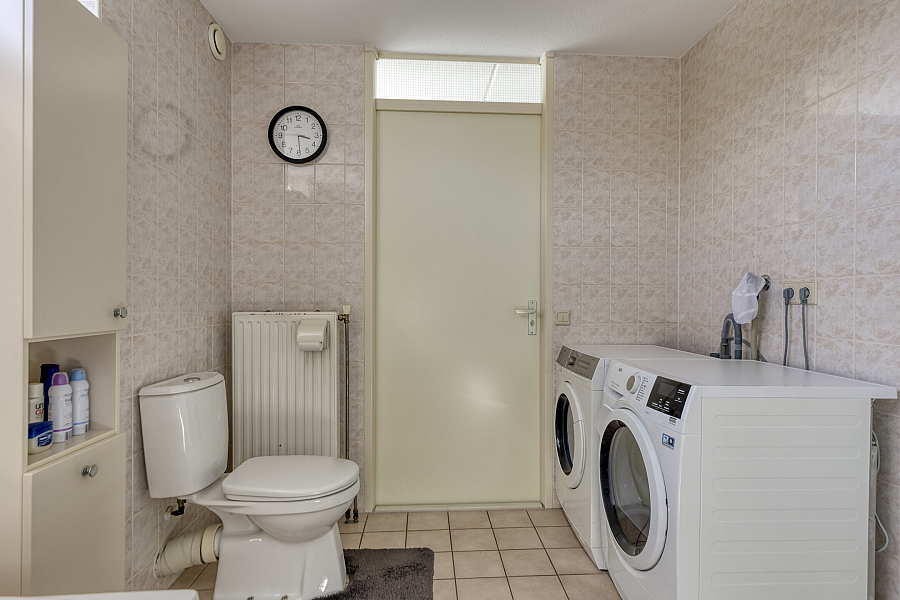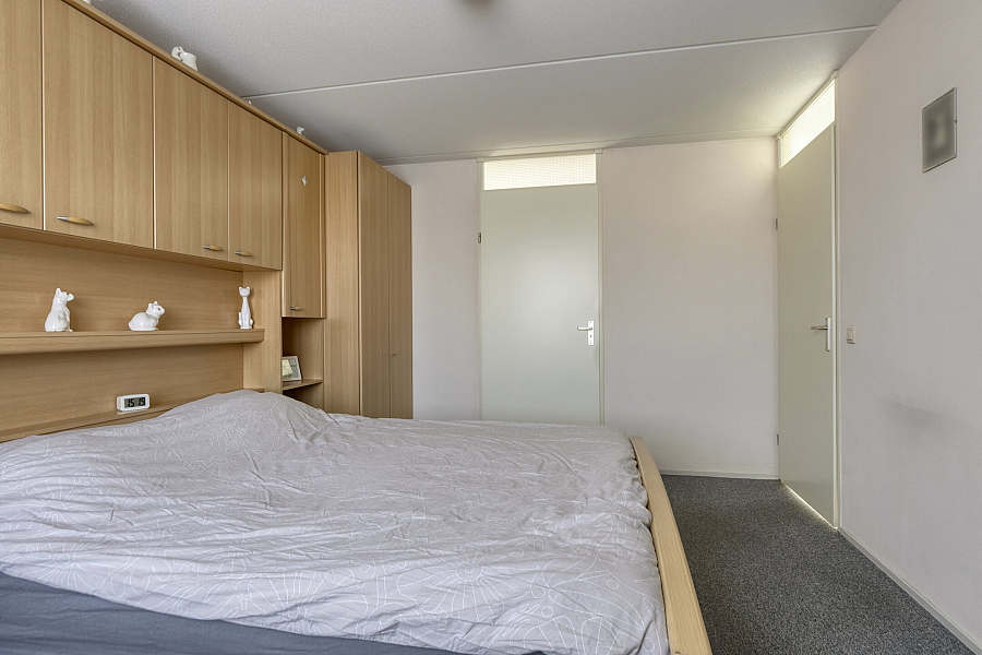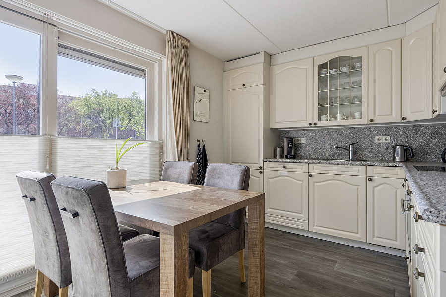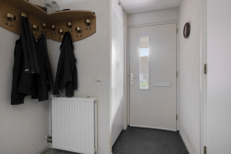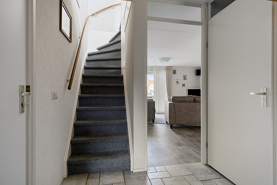 Entree met binnendoor te bereiken garage en toilet, water gerichte woonkamer met vaste kast, marmoleum vloerbedekking (ook in entree en keuken) en schuifpui naar de onderhoudsvriendelijke tuin, open keuken met schuifpui naar terras aan de voorzijde, hoekkeuken voorzien van kunststof werkblad, inbouwspotjes en inbouwapparatuur als inductie kookplaat, vaatwasser, oven, koelkast, afzuigschouw.