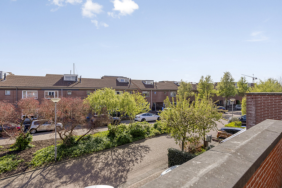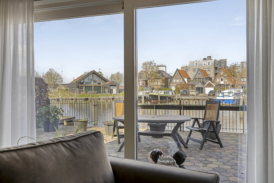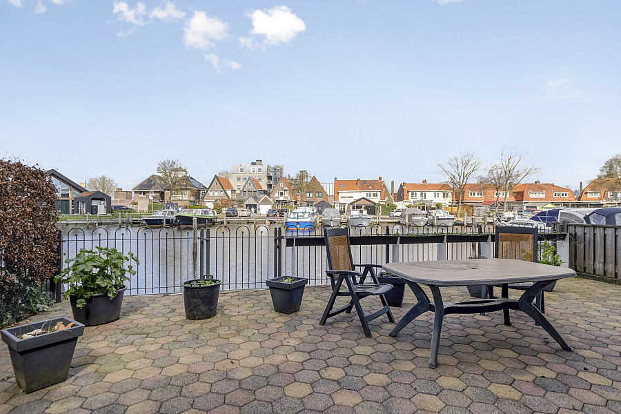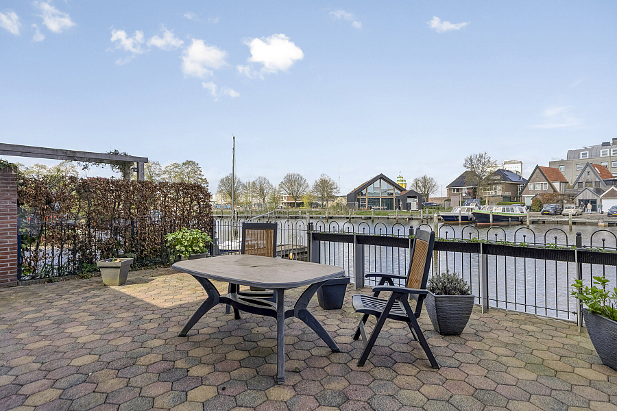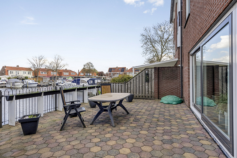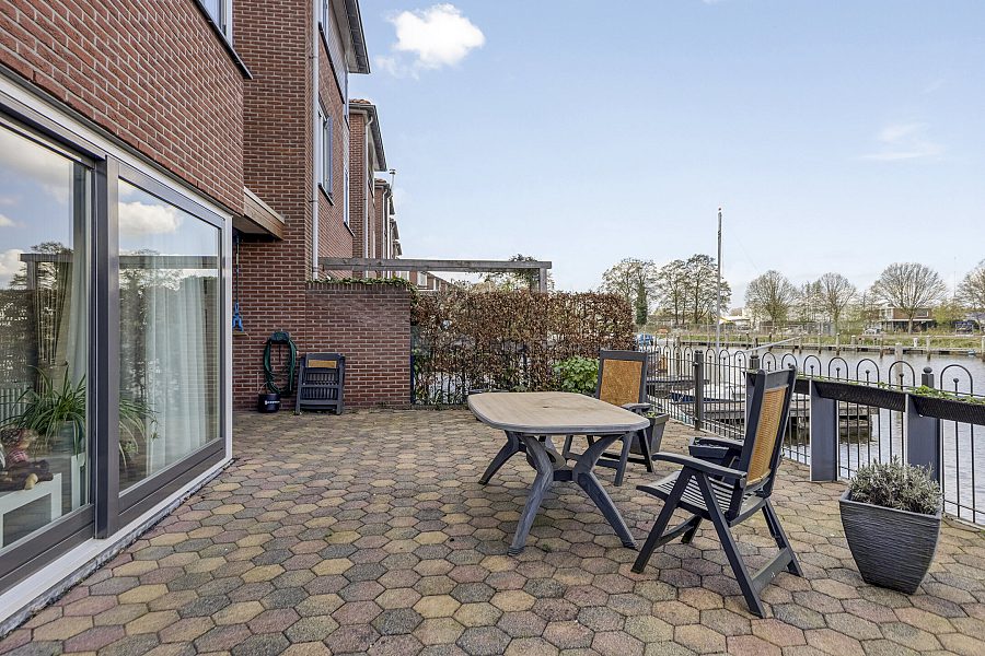 Ook aan de voorzijde van de woning is een zonnig terras aangelegd. Zowel het terras aan de waterkant als het terras aan de voorkant is vanuit de woonkamer bereikbaar via één van de twee schuifpuien.