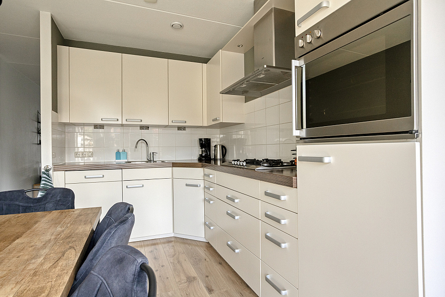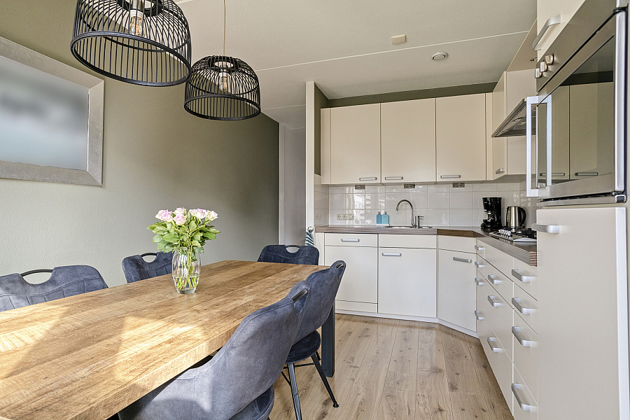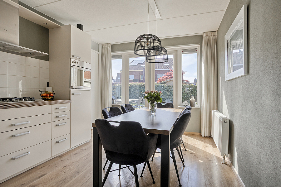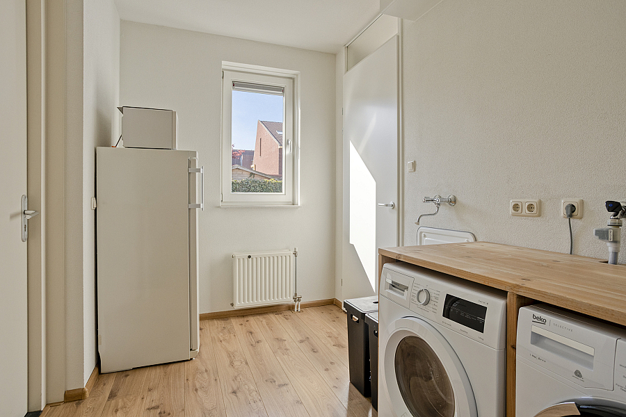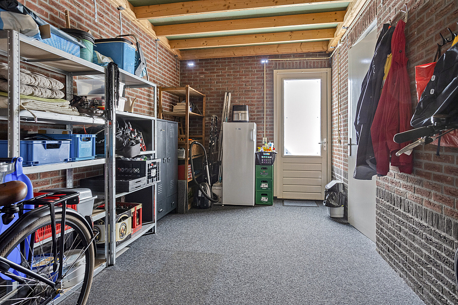 Bij binnenkomst valt direct de lichte en royale woonkamer op, een heerlijke plek om te ontspannen of samen te zijn. De aan de achterzijde gelegen keuken is praktisch ingericht en beschikt over openslaande deuren naar de op het zuiden gelegen tuin, ideaal voor lange zomerdagen waarbij binnen en buiten naadloos in elkaar overlopen. De keuken is onder andere voorzien van een koelkast, vaatwasser, 5 pits gaskookplaat en oven. Aansluitend bevindt zich de bijkeuken met aansluiting voor de wasmachine en toegang tot de aangebouwde garage.
