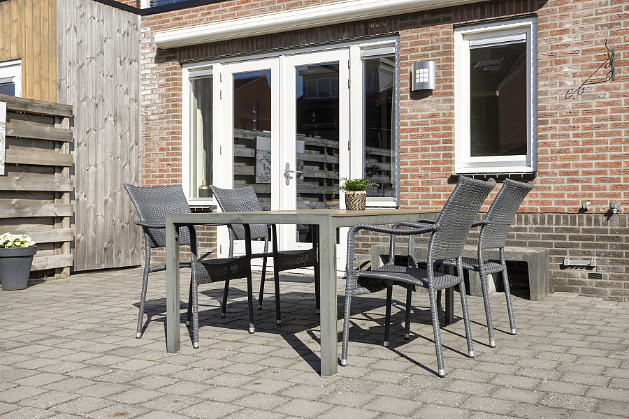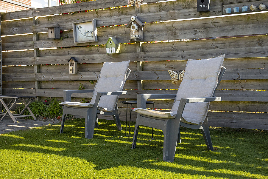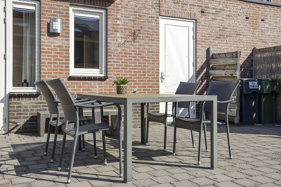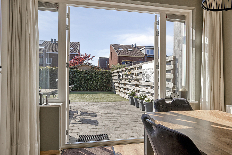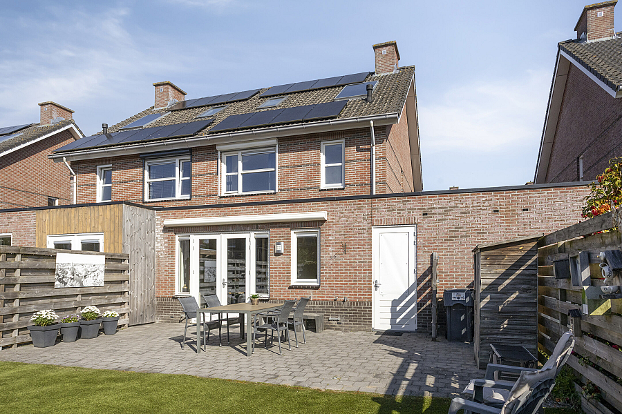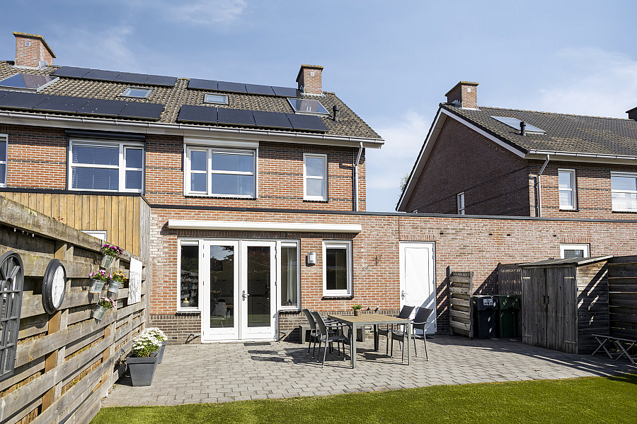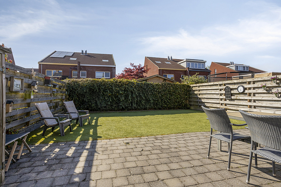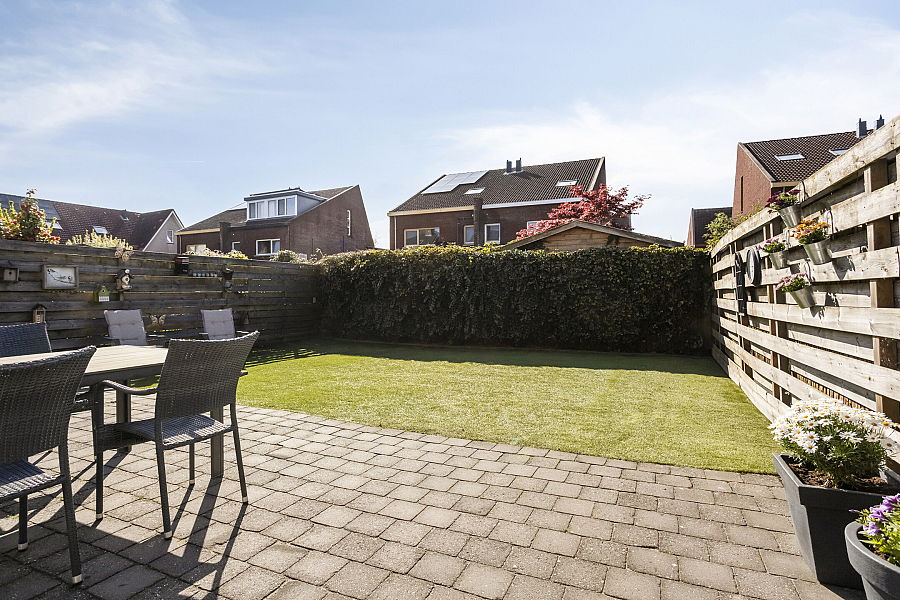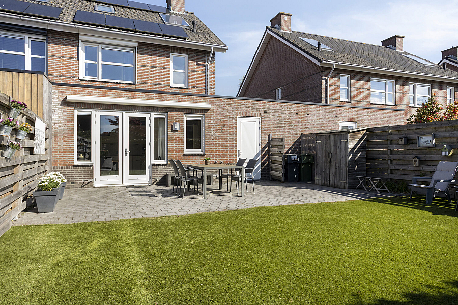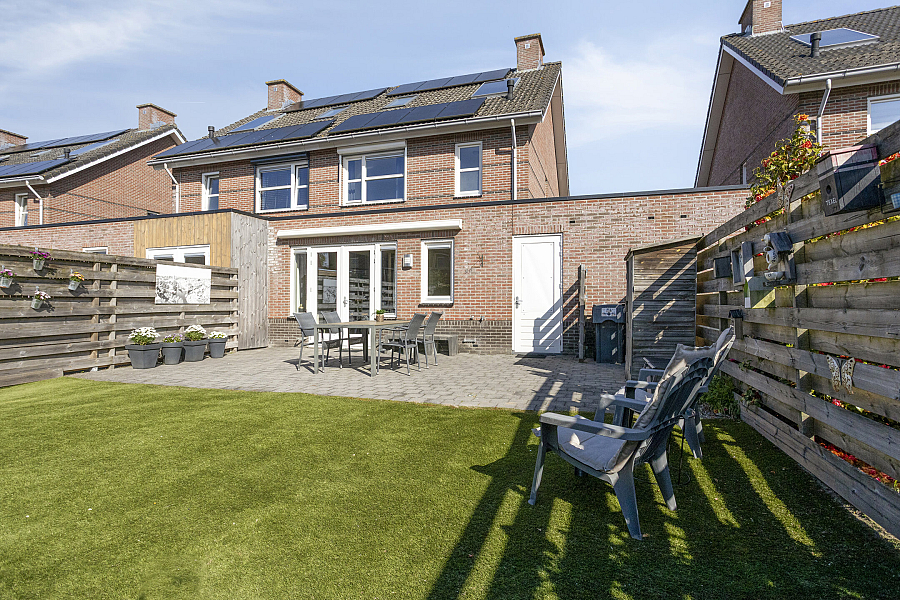 De, op het zonnige zuiden gelegen, achtertuin is verzorgd aangelegd met een combinatie van terras en kunstgras, waardoor je weinig onderhoud hebt en optimaal kunt genieten. Het elektrische zonnescherm aan de achtergevel zorgt voor extra comfort op zonnige dagen.